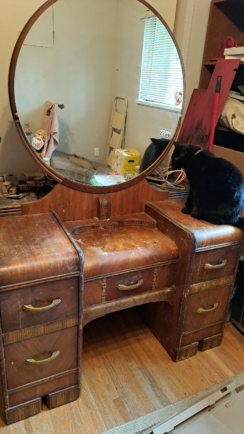 65Solid piece incl. bench seat (no pic). Selling a vintage vanity with a round mirror. It has a unique design and lots of storage with drawers on both sides. The vanity appears to be from the brand VAN, as seen on the back. It would make a great addition to any bedroom!