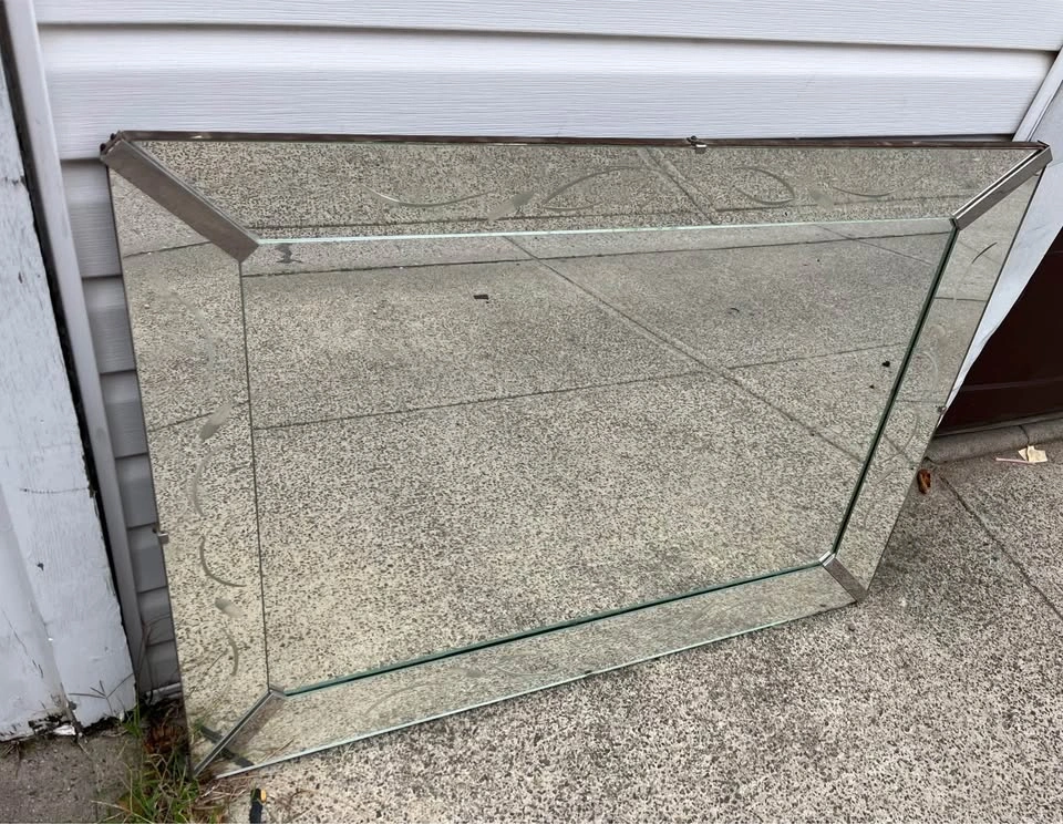 This is a vintage Venetian-style mirror with etched designs and beveled edges. This mirror was first hung in 1940’s or 50’s (not sure of exact date but that was the time period) as decorative accent in a master bedroom. Even 70-80 years later it still adds a touch of elegance and sophistication to any space. This mirror is in very good shape for its age. It’s approximately 45inx33in Cash Only Pickup in Sheepshead Bay Brooklyn