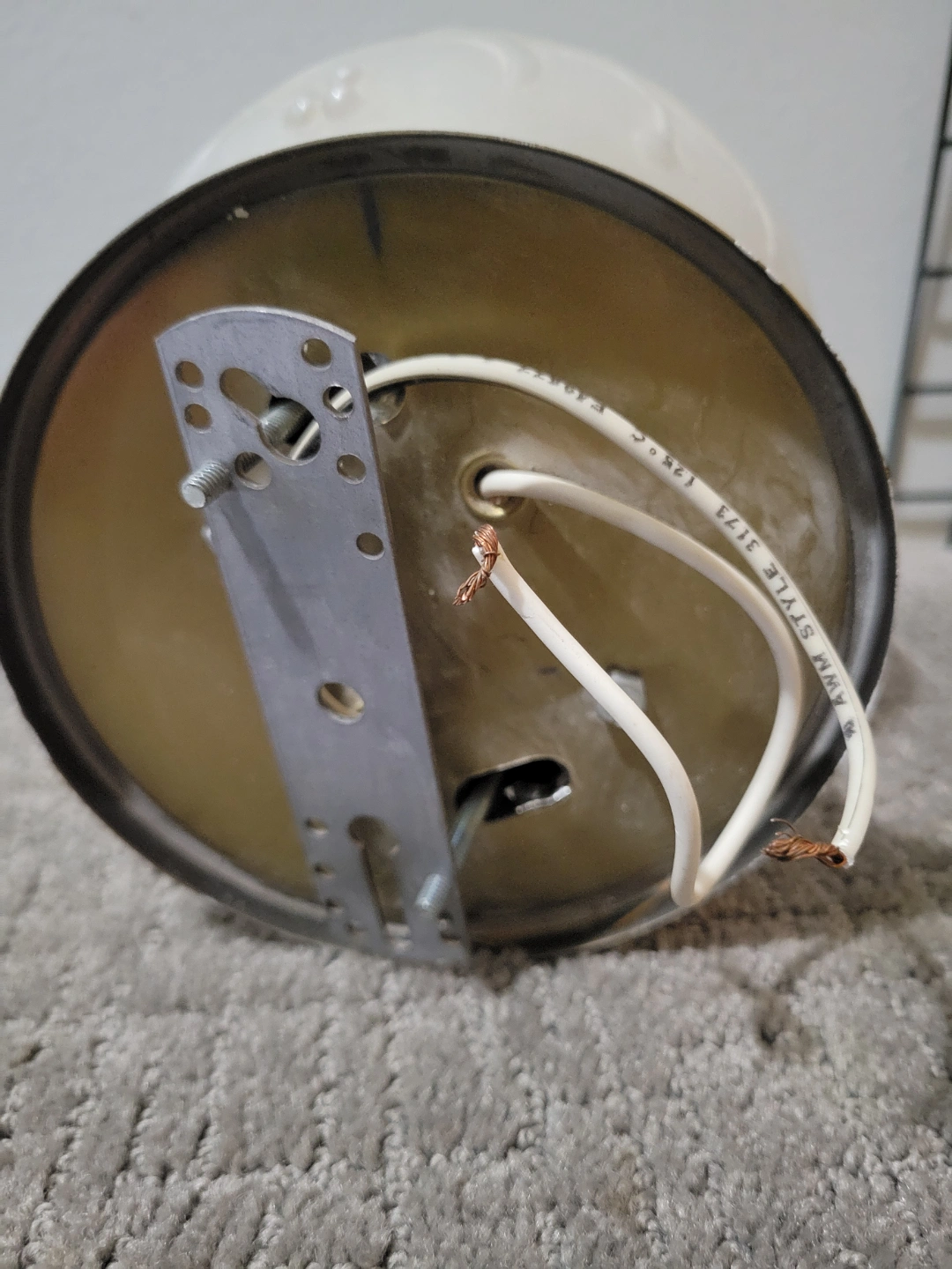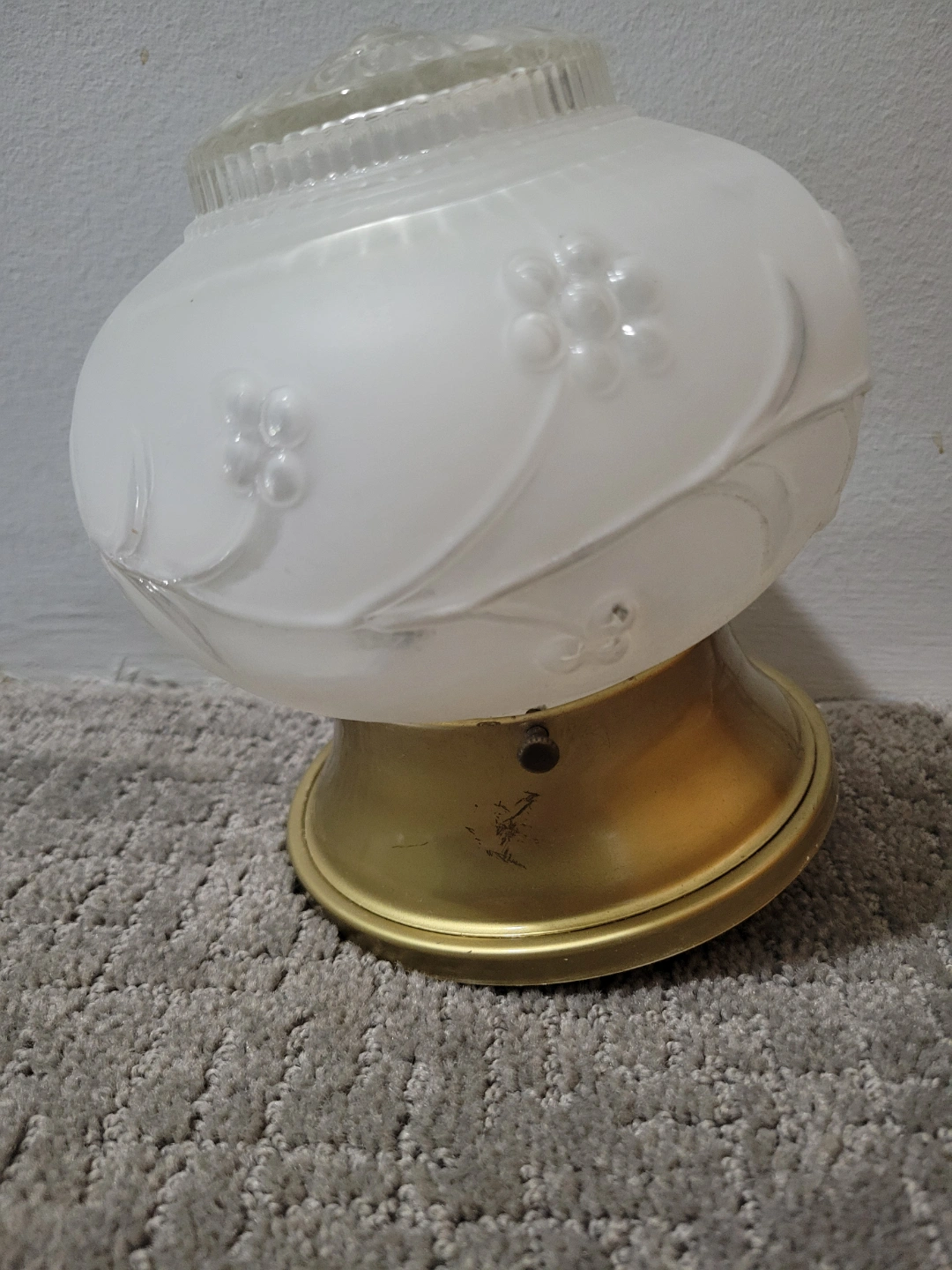 Beautiful vintage light fixture. White glass globe with floral pattern. Gold coloured base. Wiring included. Pre-owned.