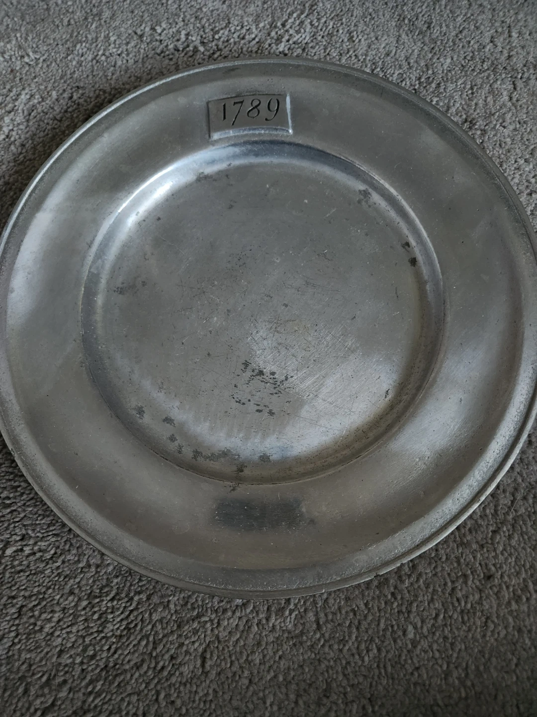 5Selling a vintage pewter plate marked with the year 1789. It features markings indicating "Wilton Columbia, PA" and an "RWP" stamp. A unique piece for collectors or anyone interested in historical items!