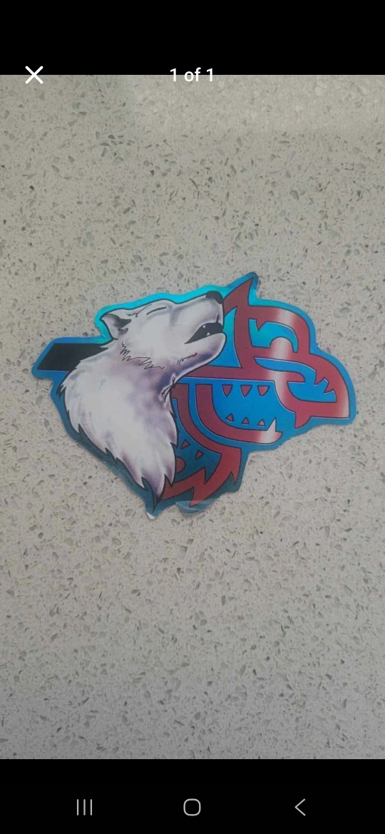 Here's a cool wolfpack sticker! It has a wolf head and a sports design in blue and red. Perfect for decorating your laptop, water bottle, or anything else you want to personalize. It is vintage and over twenty years old .