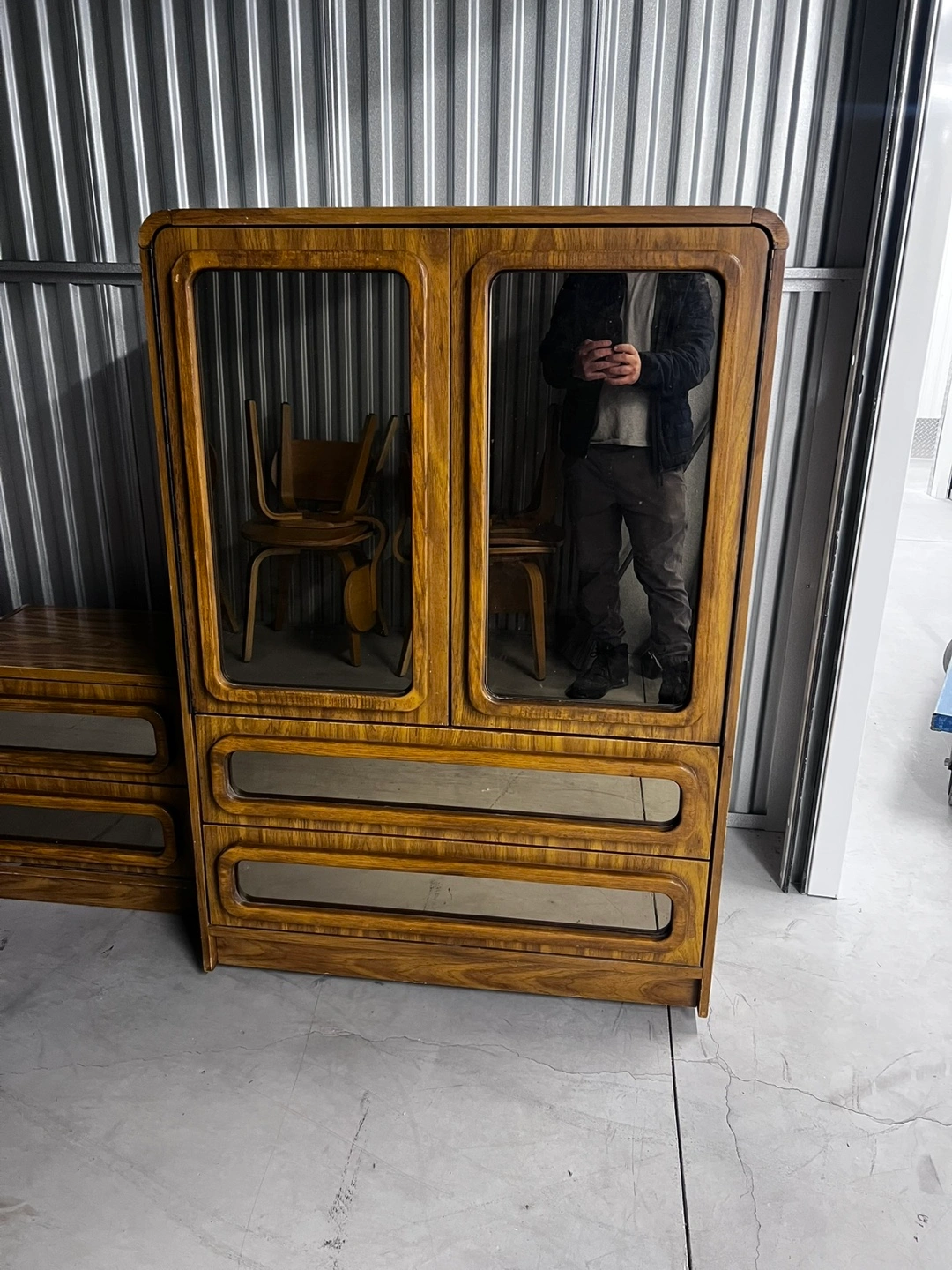 10Selling a vintage wood bedroom set that includes a dresser, wardrobe, and two nightstands. The set has a unique retro design with a warm wood tone. It's a great way to add some vintage charm to your bedroom!