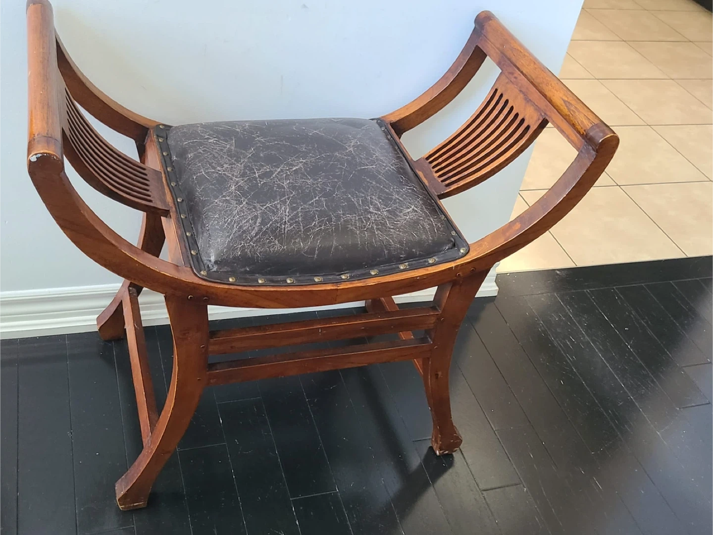 10Selling a vintage wood bench with a leather seat. It has a unique curved design and would be a great addition to any home. The leather seat shows some wear, but it adds to the character of the piece