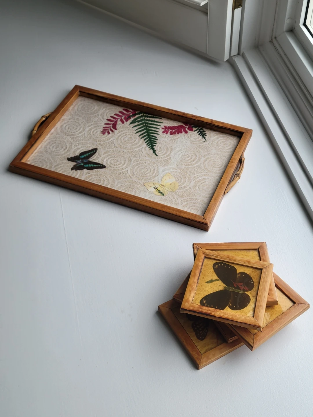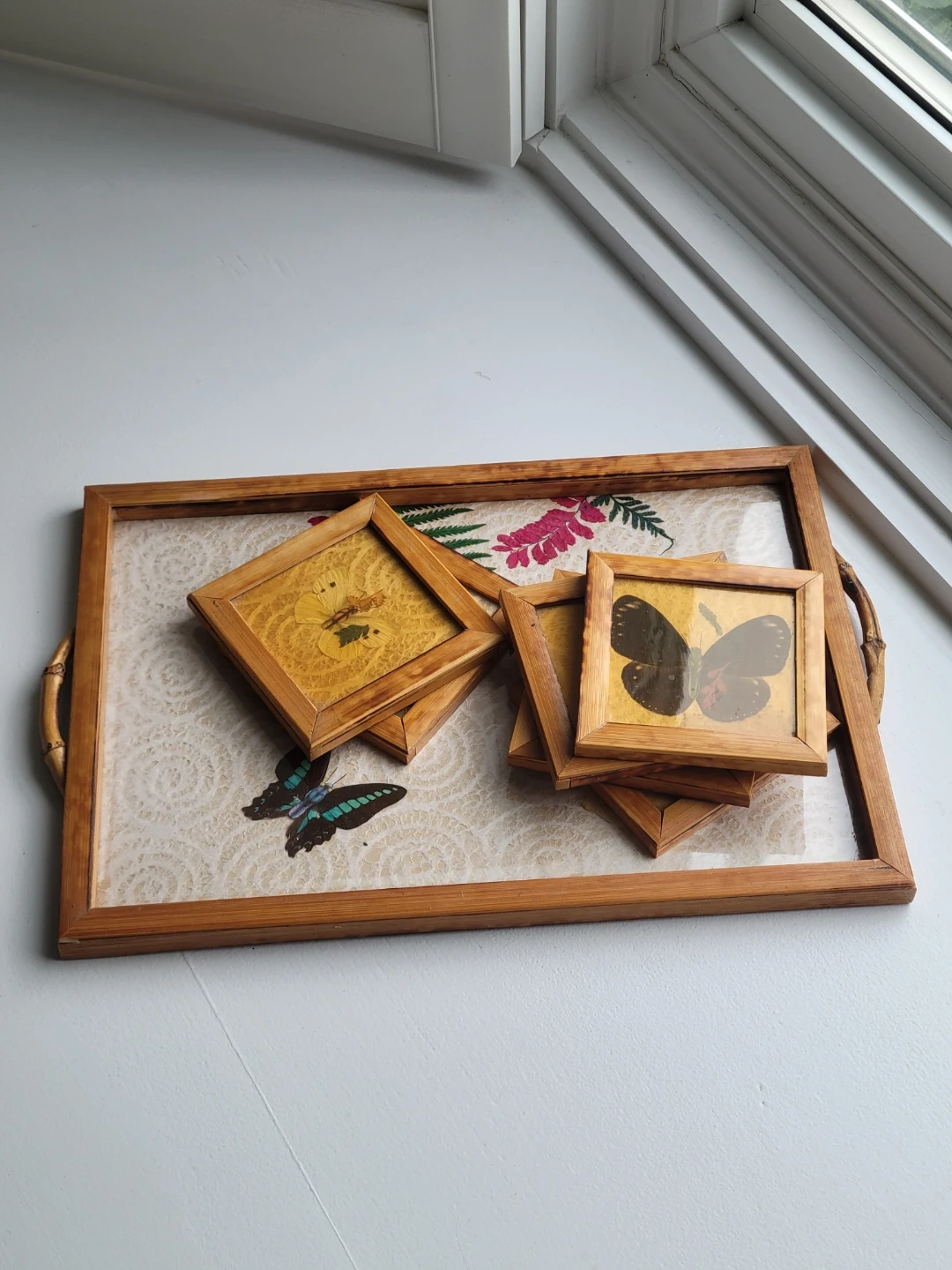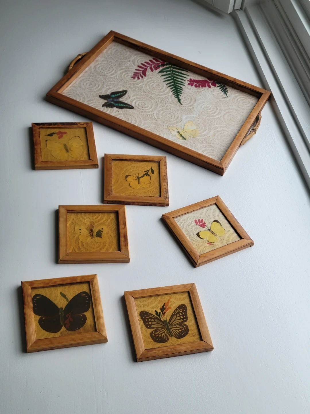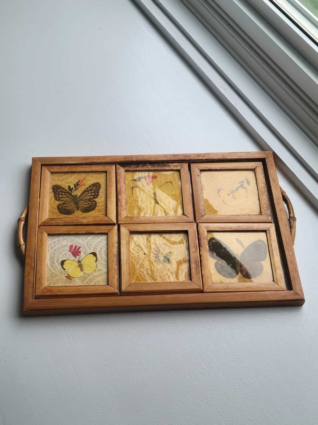 103This Vintage Set features delicate butterfly and botanical designs preserved under glass, perfect for adding a unique, vintage charm to any room. * Set includes one tray and six coasters * Material: Wood, glass, preserved butterflies * Design: Butterfly and botanical motifs * Style: Vintage 13.5" x 9" tray 4" coasters This set is in good condition, with minor signs of wear that add to its vintage appeal. If this ad is still up, then yes, it's still available! $40/6 coasters and tray! Firm Fennell and Upper gage Hamilton. Please see my many other ads too