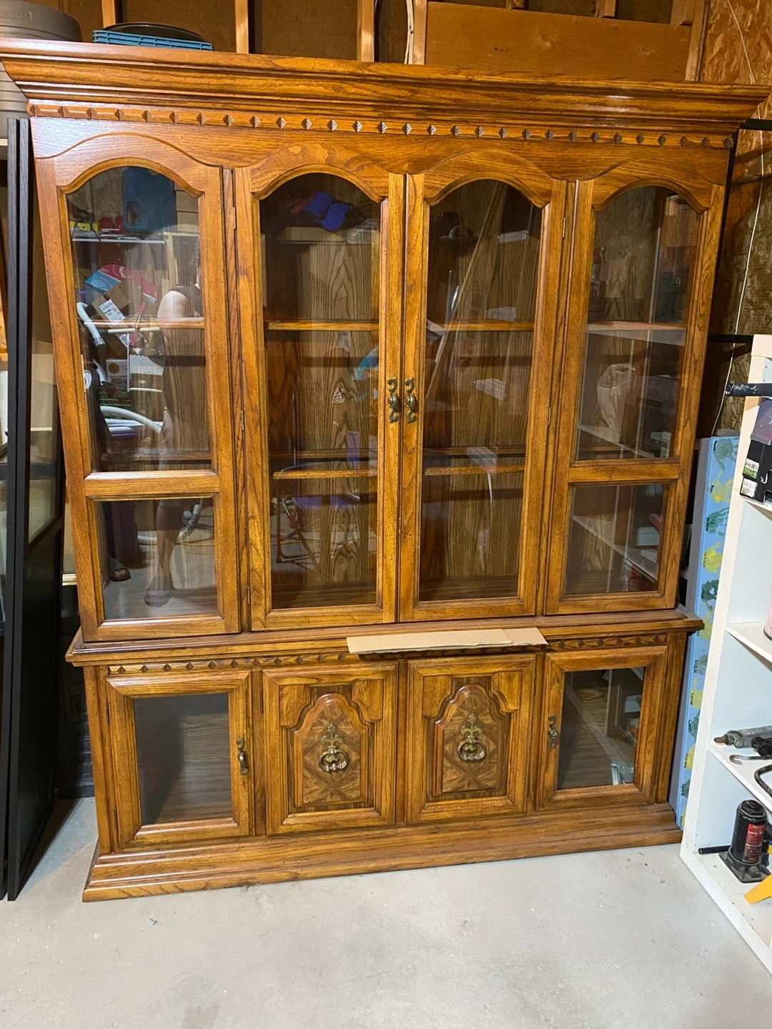 42Selling a vintage wood china cabinet. It features glass doors on both the top and bottom sections, as well as built in lighting, and decorative wood detailing. Perfect for displaying your favourite dishware or collectibles!