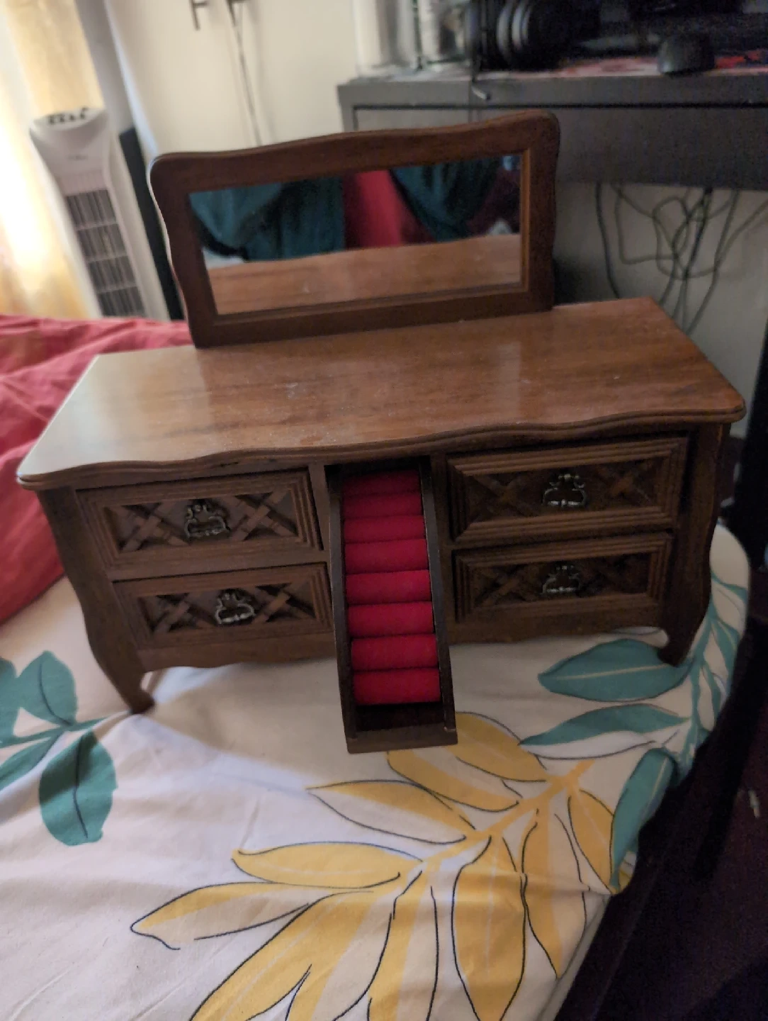 Here's a lovely vintage jewelry box made of wood. It features a mirror and several drawers, perfect for organizing your precious items. The interior is lined with red felt, adding a touch of elegance. It's a great piece for any dresser or vanity!