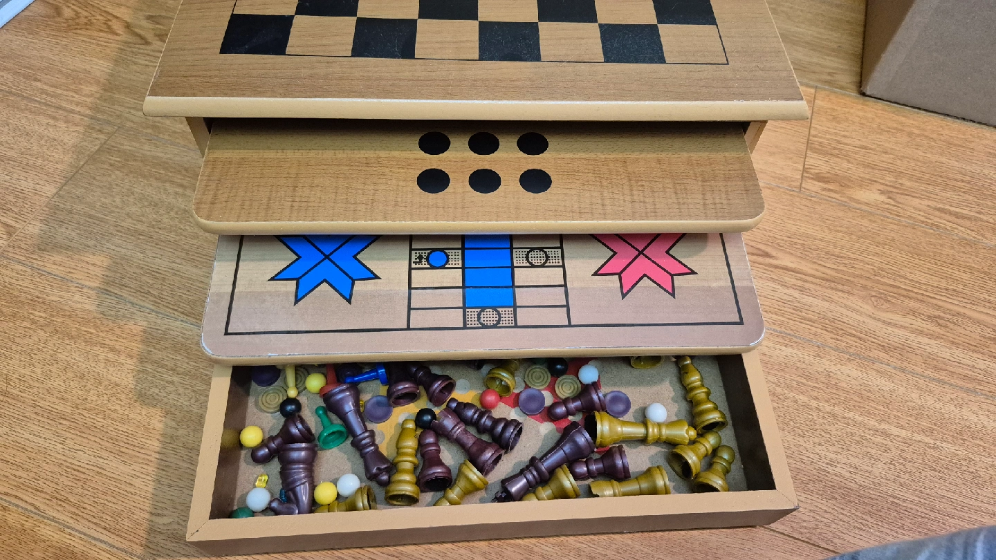 13Selling a fun, vintage wooden 5-in-1 board game set! It features chess, checkers, Chinese checkers, backgammon, and a ludo-like game. All pieces are included and stored in a convenient drawer. Perfect for family game nights!