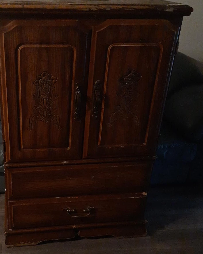 I'm selling a vintage wooden armoire! It features a two-door cabinet with decorative floral carvings and a drawer at the bottom. It shows some signs of wear and tear, but it could be a great addition to a room with a bit of restoration