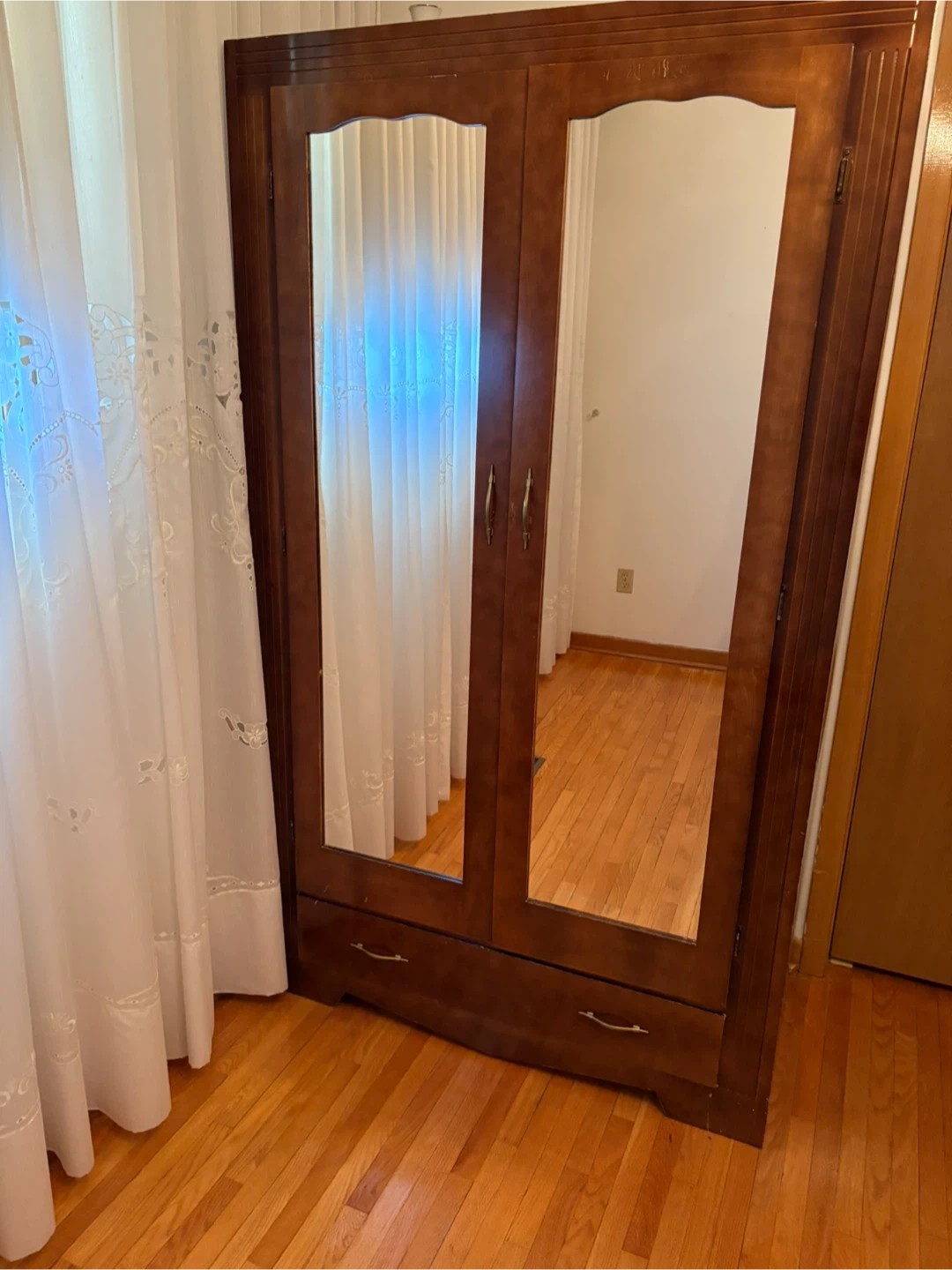10Selling a vintage wooden armoire. It features mirrored doors and two drawers at the bottom for extra storage. It's perfect for adding a touch of classic style to any bedroom or living space. Great for organizing clothes and accessories