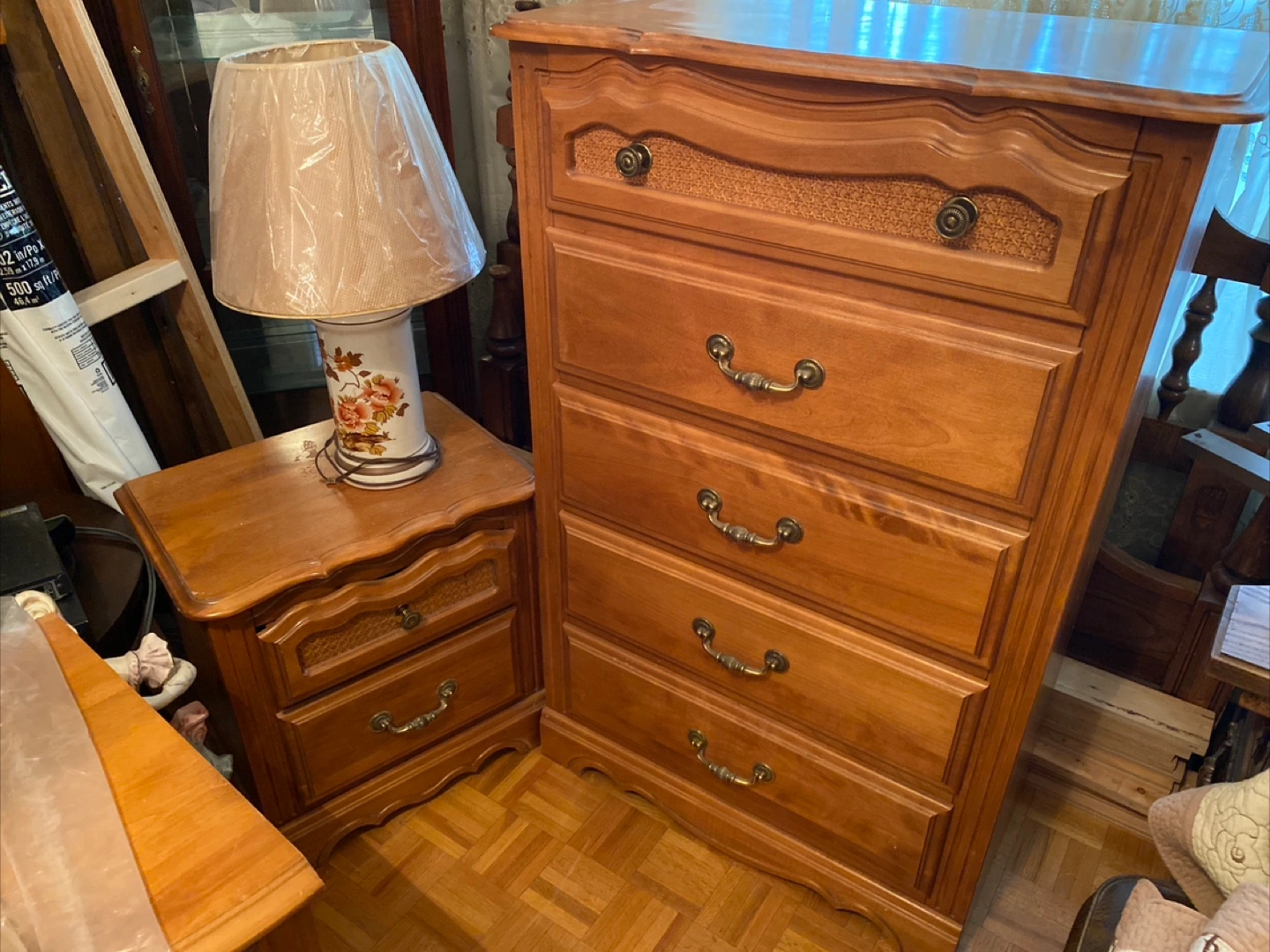 Selling a charming vintage wooden bedroom set. Includes a tall dresser, a nightstand, a headboard, and a dresser with a mirror. All pieces feature a beautiful wooden finish with a classic design. Perfect for adding a touch of vintage style to your bedroom!