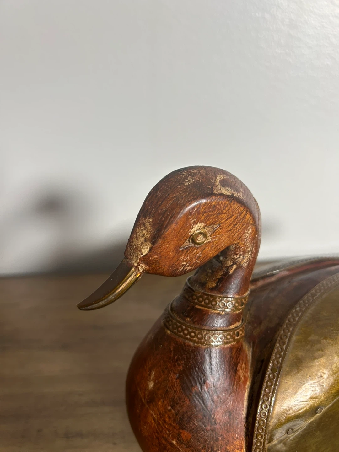 23Add timeless charm to your home or collection with this beautifully handcrafted wooden duck featuring an elegant brass overlay. • Material: Solid wood with intricate brass detailing • Dimensions: 9" long × 6.5" tall • Condition: Vintage – minor crack on the bottom (does not affect display) Price: $60. Cash or e-transfer on the spot is accepted. Pick up in NDG.