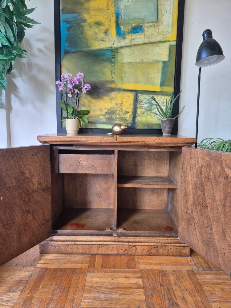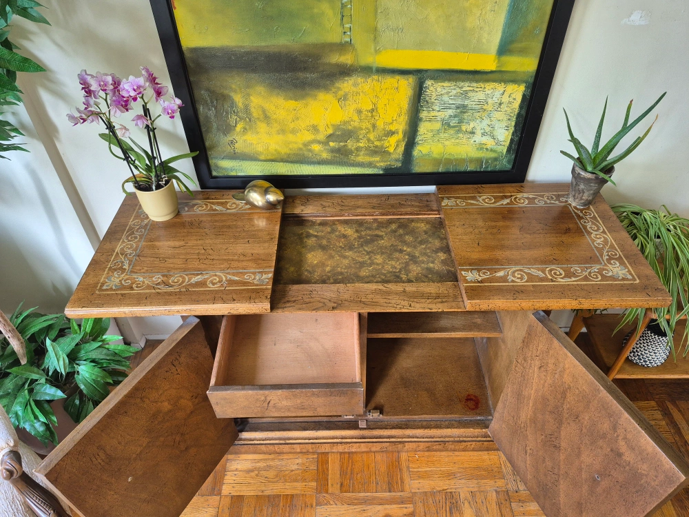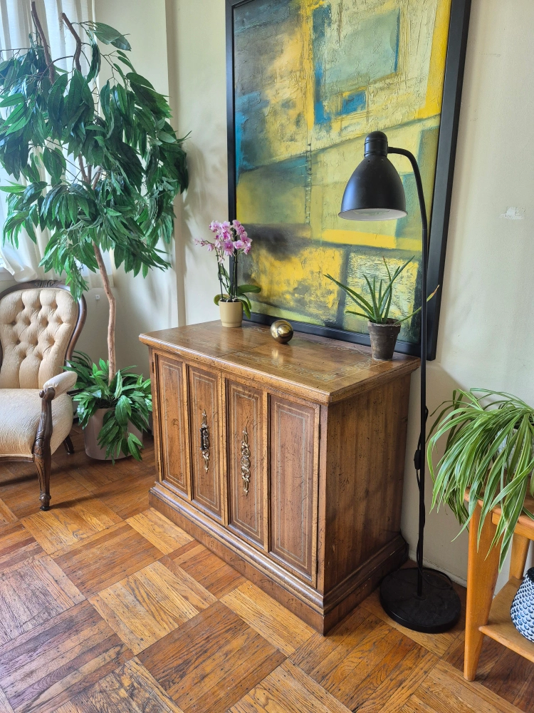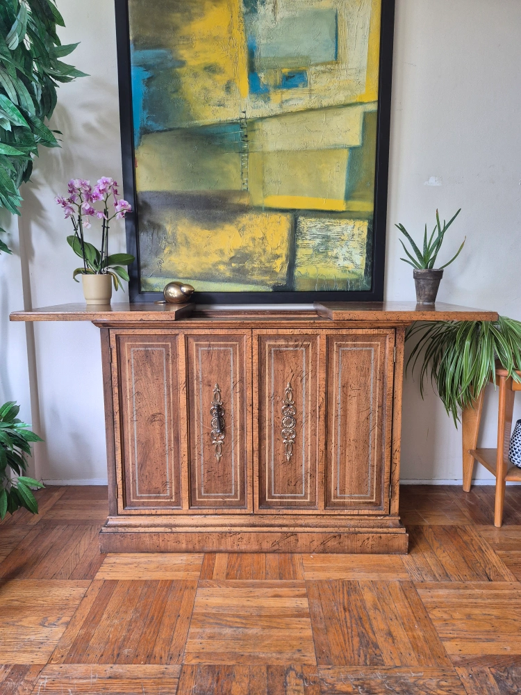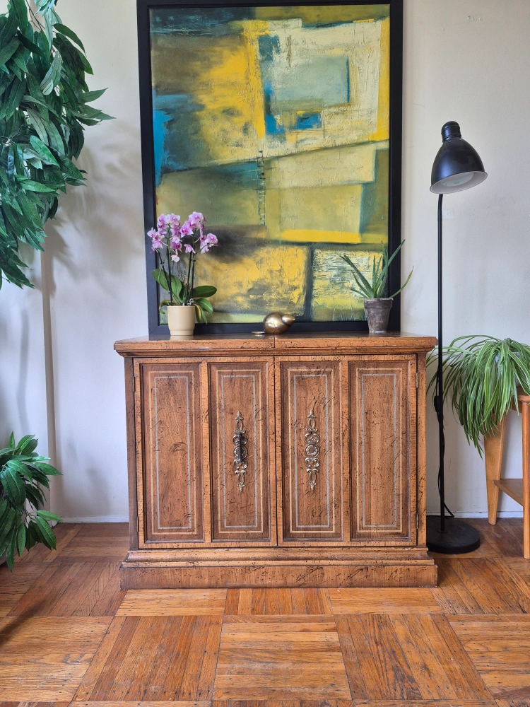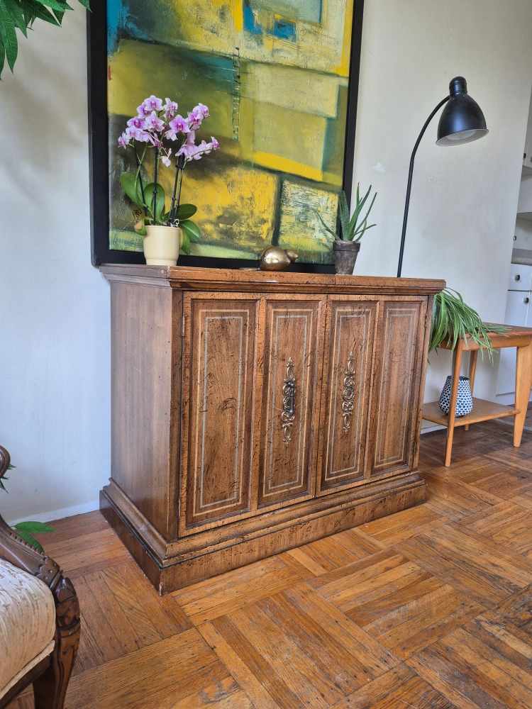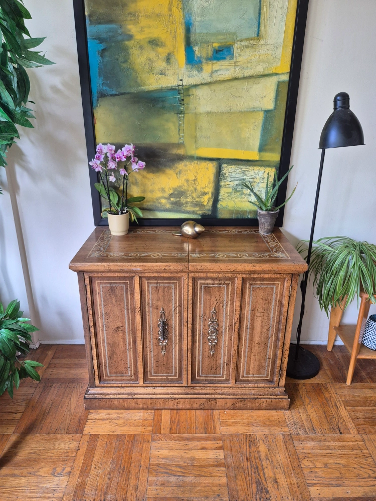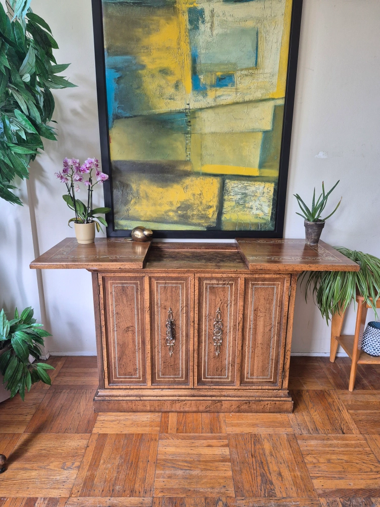 Beautiful vintage wooden cabinet with ornate detailing and elegant metal handles. 38-56w x 19d x 30.5h ✨ Features: Expandable top with decorative inlay design (great for extra serving space) Double-door storage with shelves and a pull-out drawer Perfect for use as a bar, sideboard, or entryway cabinet Condition: Good vintage condition with normal wear consistent with age (see photos). Solid and sturdy piece with tons of character. Pick up in downtown Vancouver or delivery may be arranged for a reasonable fee. Priority is given to those who are able to pick up. Follow us on Instagram to enjoy an exclusive discount on select furniture items: https://www.instagram.com/vanvaluevintage Tags: retro vintage antique burl wood rosewood walnut brass gold copper 1920s 1930s 1940s sideboard credenza buffet server Hutch cabinet tv bench hallway table console table entertainment unit living room dining room mcm mid century modern furniture retro vintage vinyl records lps credenza sideboard server Hutch Fleetwood Phillips rca teak stereo 1950s 1960s 1970s sixties pioneer techincs rental