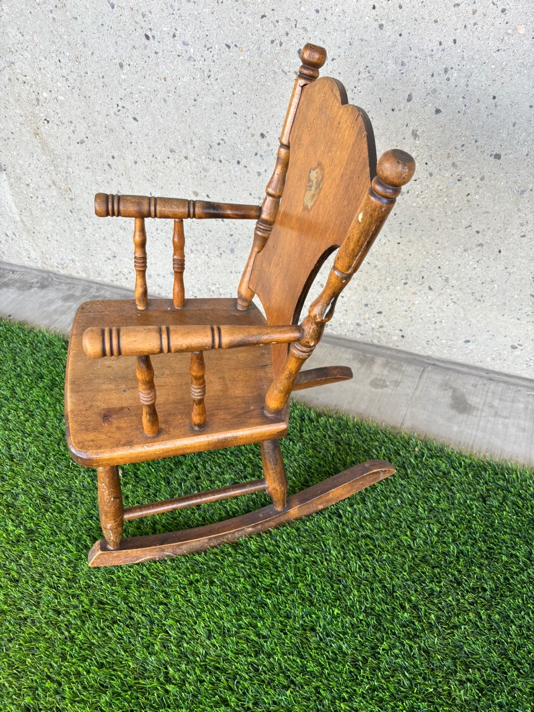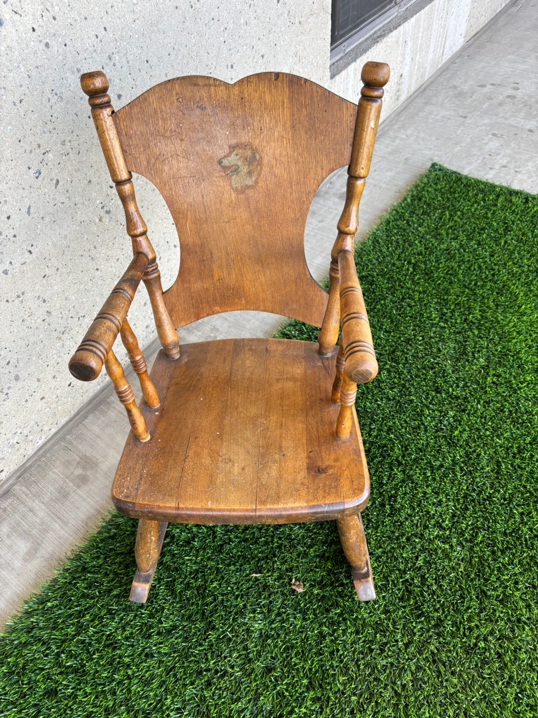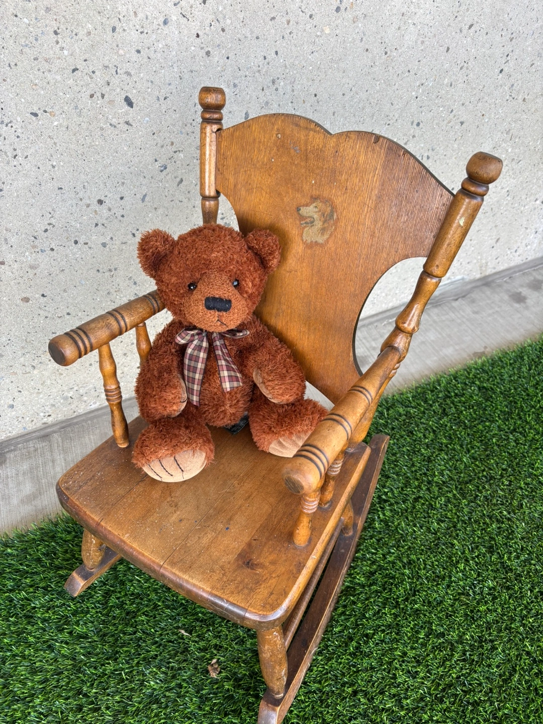 Here's a vintage wooden rocking chair, perfect for a child's room or play area. It has a charming, classic design and a sturdy build. There is a logo of a collie engraved on the back of the chair. Keep the way it is or restore it to your own style. All wood and glue construction. Asking $50, comes with bear stuffy.