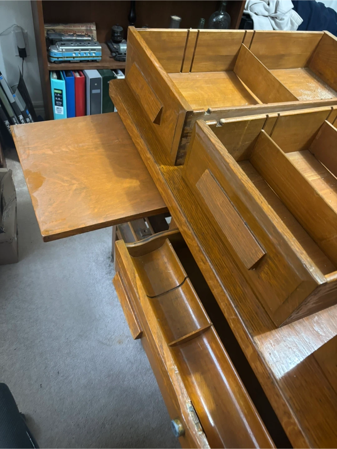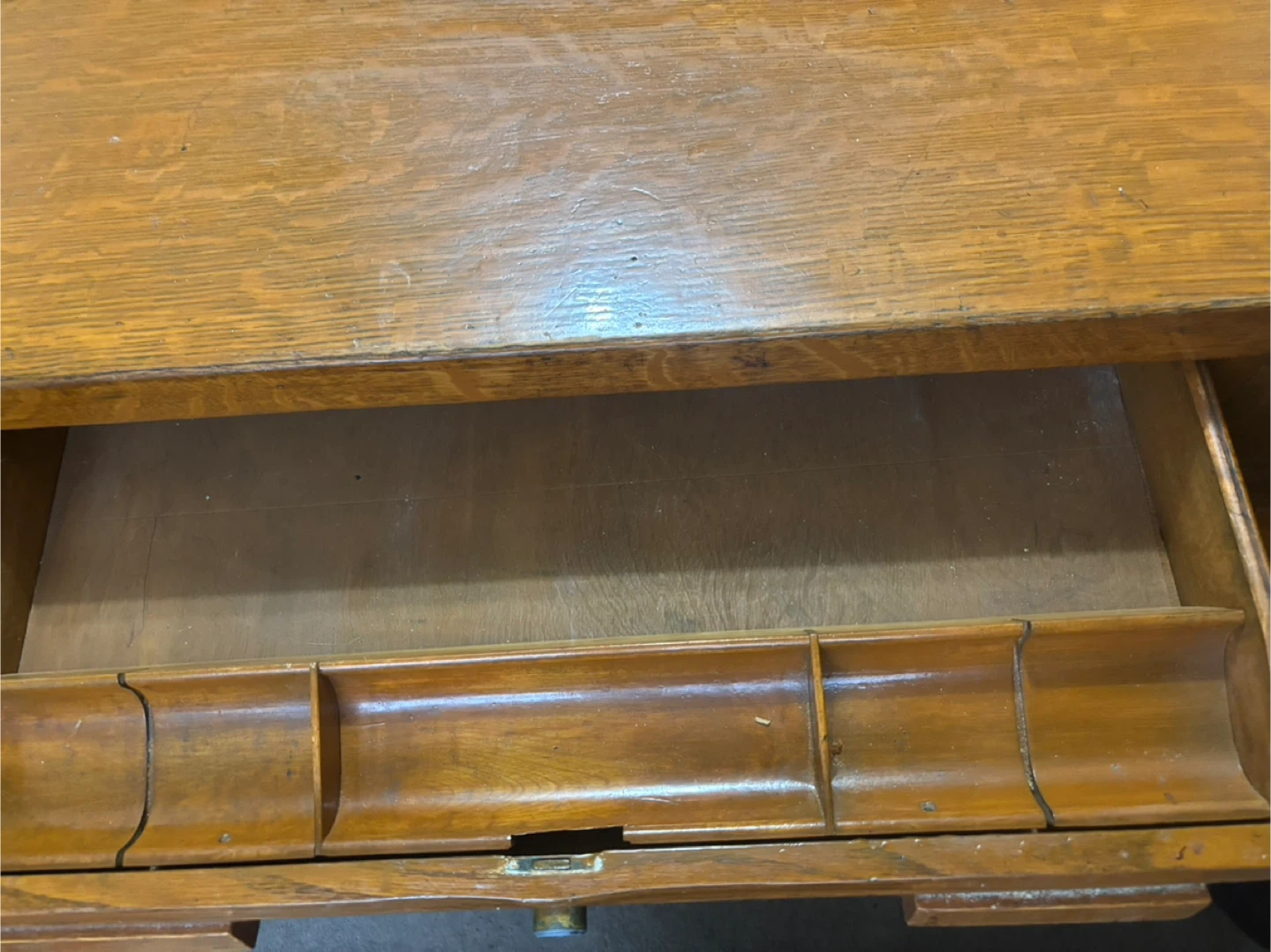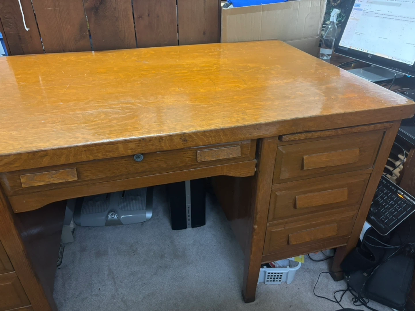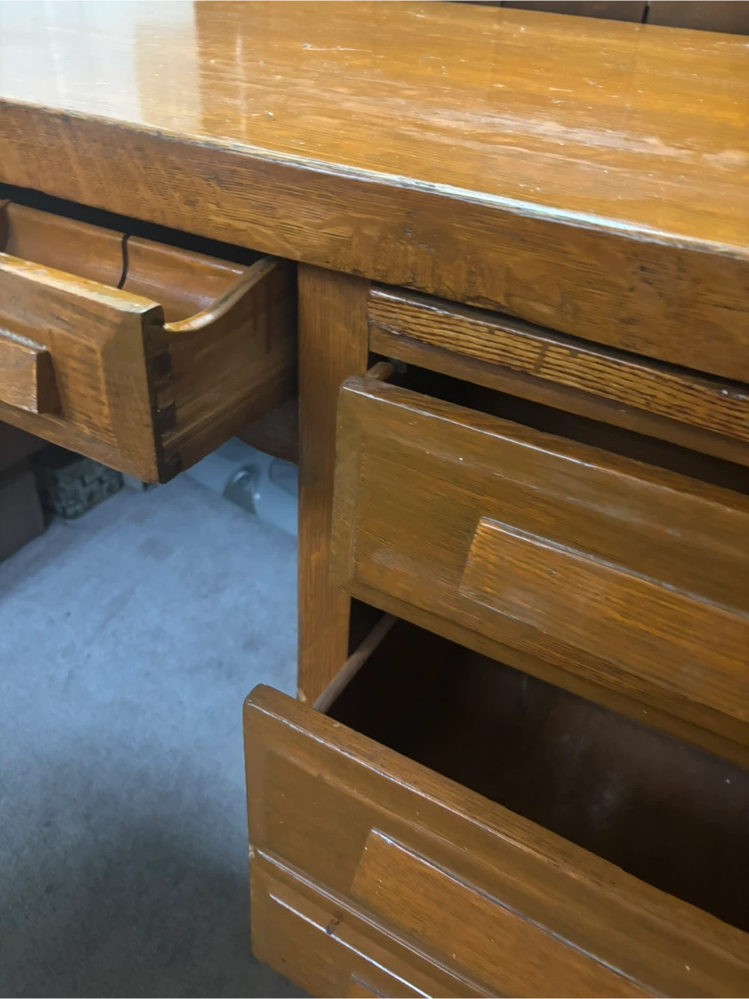 36Here's a vintage wooden desk with a classic look. It features drawers on both sides for storage. It's perfect for a home office or study area! Very heavy (will be in a few pieces for pickup) - will need to bring help to move 34” deep x 30 1/4” tall x 5 feet long
