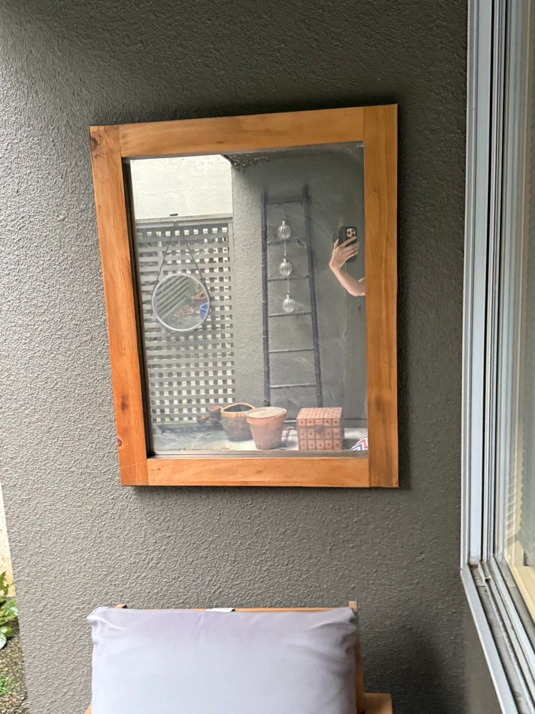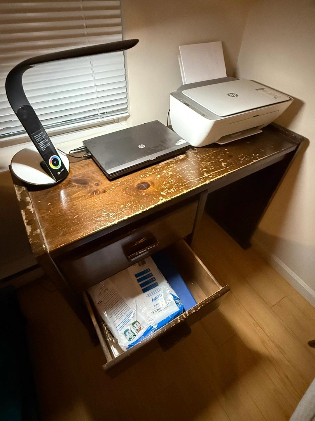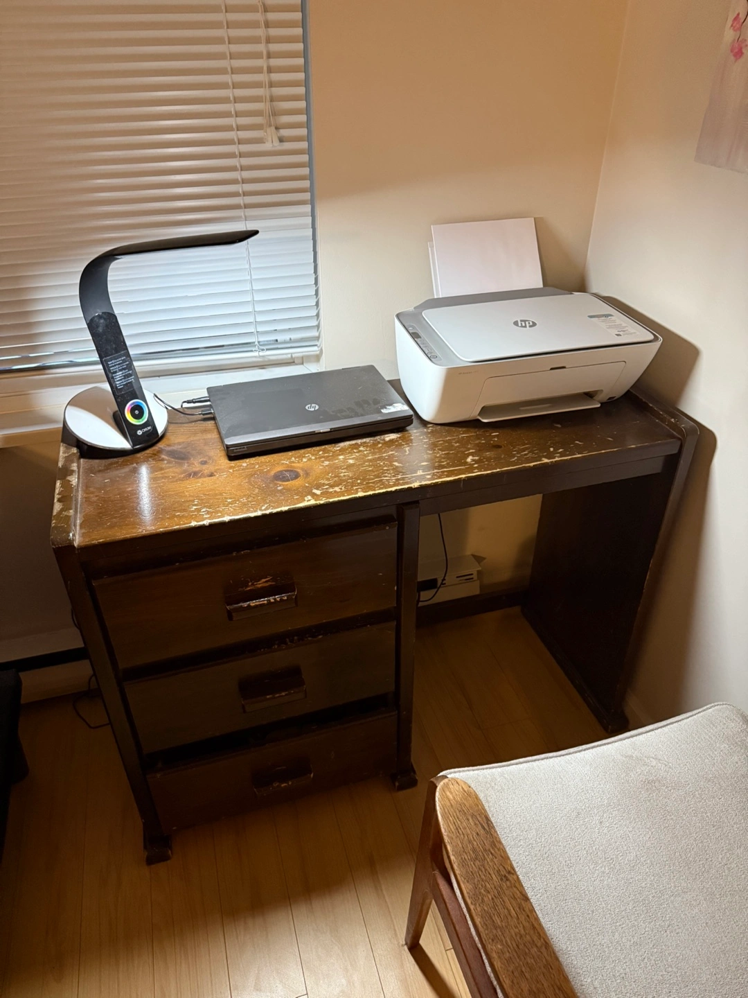 Dark brown wooden vanity or desk. Has Three drawers and a mirror. Shows some wear. Good for a home office or small space. Its a vanity from the 1980s. Solid wood. Comes with mirror. With a little love it can be a beautiful piece. Pick up only