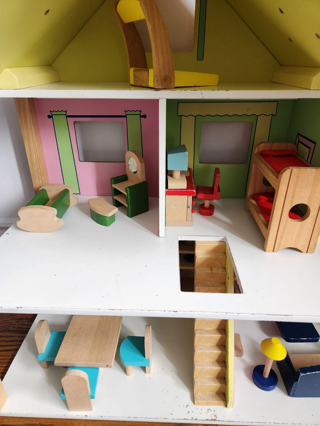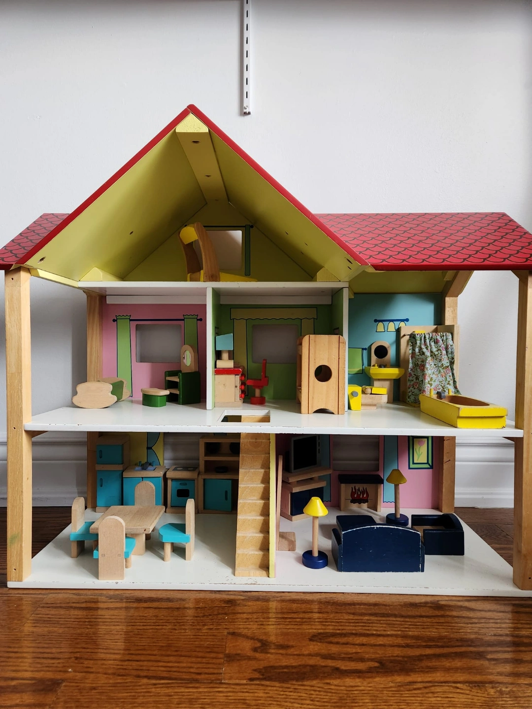 Two-story dollhouse. Features multiple rooms, including a kitchen, living room, and bedroom. Includes several pieces of wooden furniture.
