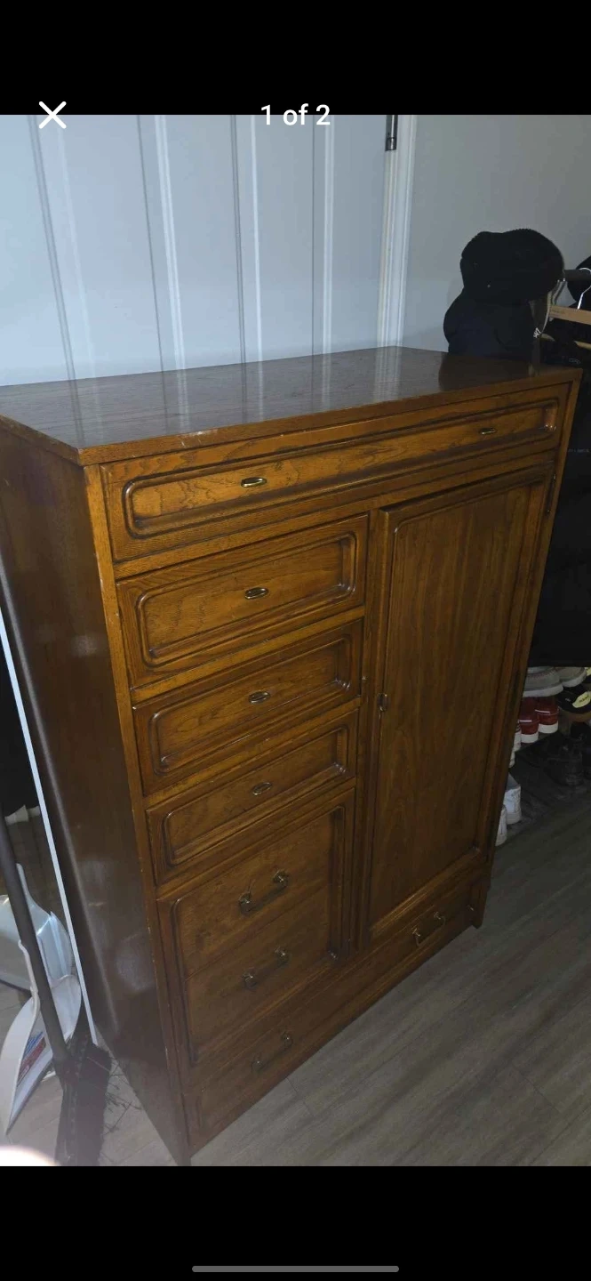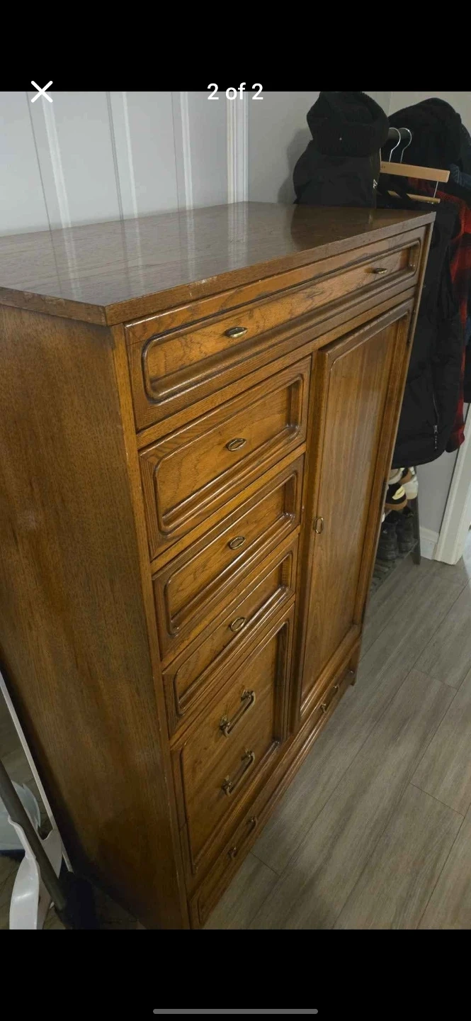 5Selling a vintage wooden dresser/wardrobe. It has several drawers and a cabinet. It's in good condition few scratches and would be a great addition to any home! Measurements 18.5" width, 37" long, 56.5" tall Asking 70 or obo