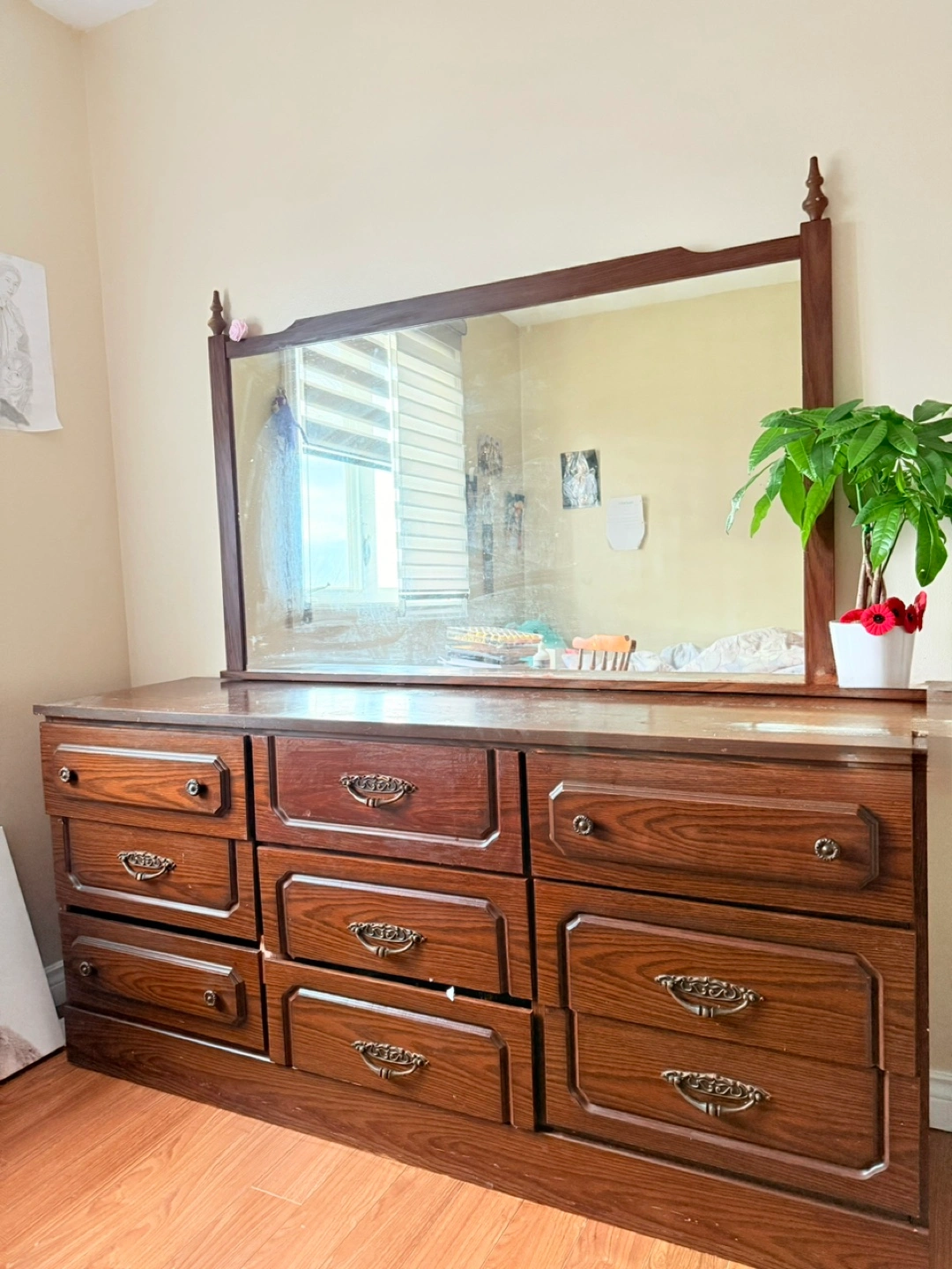 Dark brown wooden dresser with eight drawers and a mirror. Ornate drawer pulls. Some wear and tear. sturdy build, and classic design. The mirror stand was slightly broken but has been securely fixed with a drill—it still holds well. Some minor wear from normal use, but overall in good