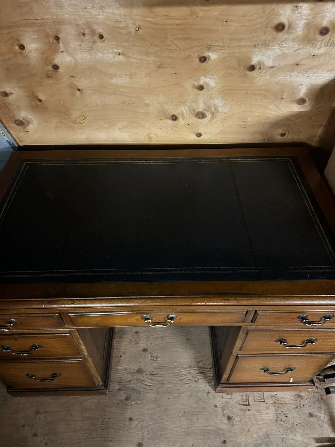 15Selling a vintage Victorian oak executive desk. It has a classic design with multiple drawers for storage. The desk shows some signs of wear, but it's still in good condition for its age. Approximately 125 years old, gently restored 30 years ago. Blue and gold leather top, originally from the uk.