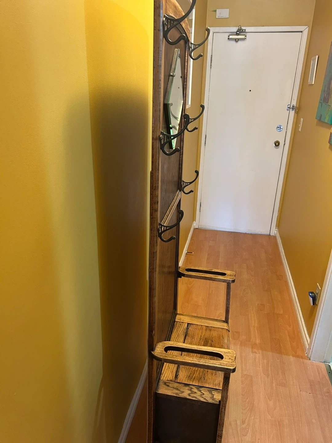 10Here's a charming vintage wooden hall tree! It features a mirror, coat hooks, and a built-in bench with storage underneath. It's a lovely piece to add character to your entryway or hallway