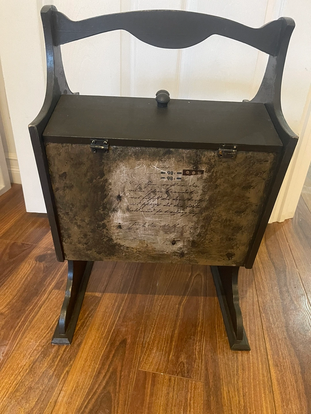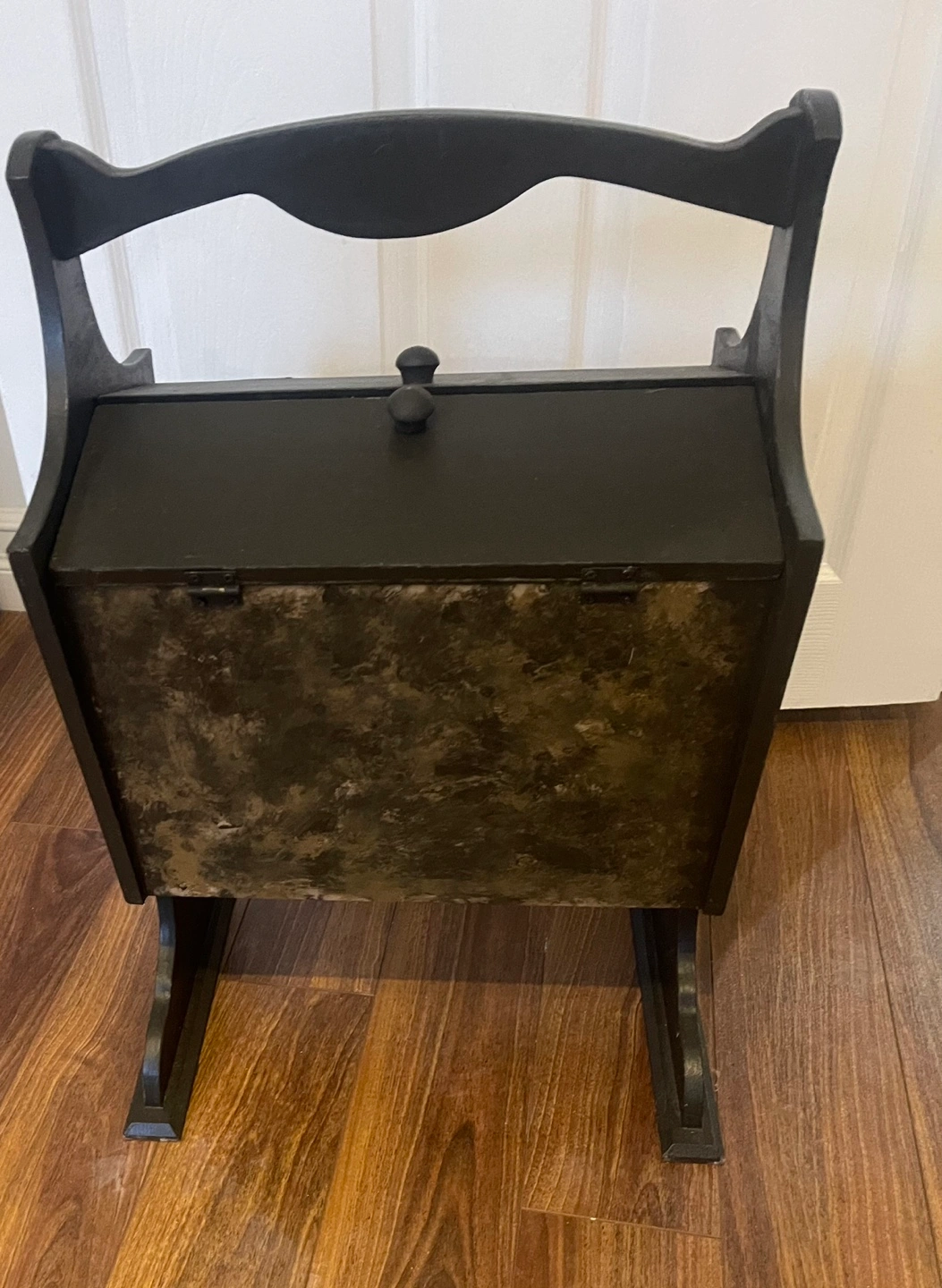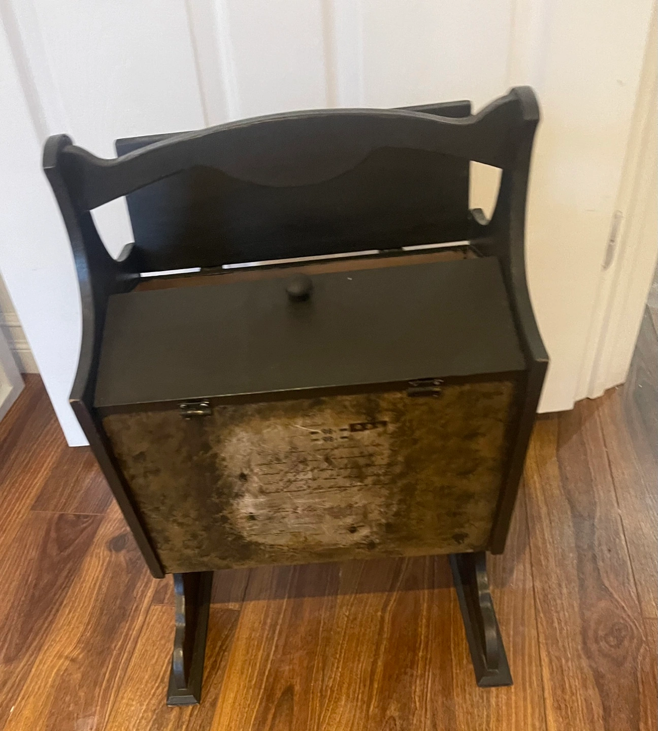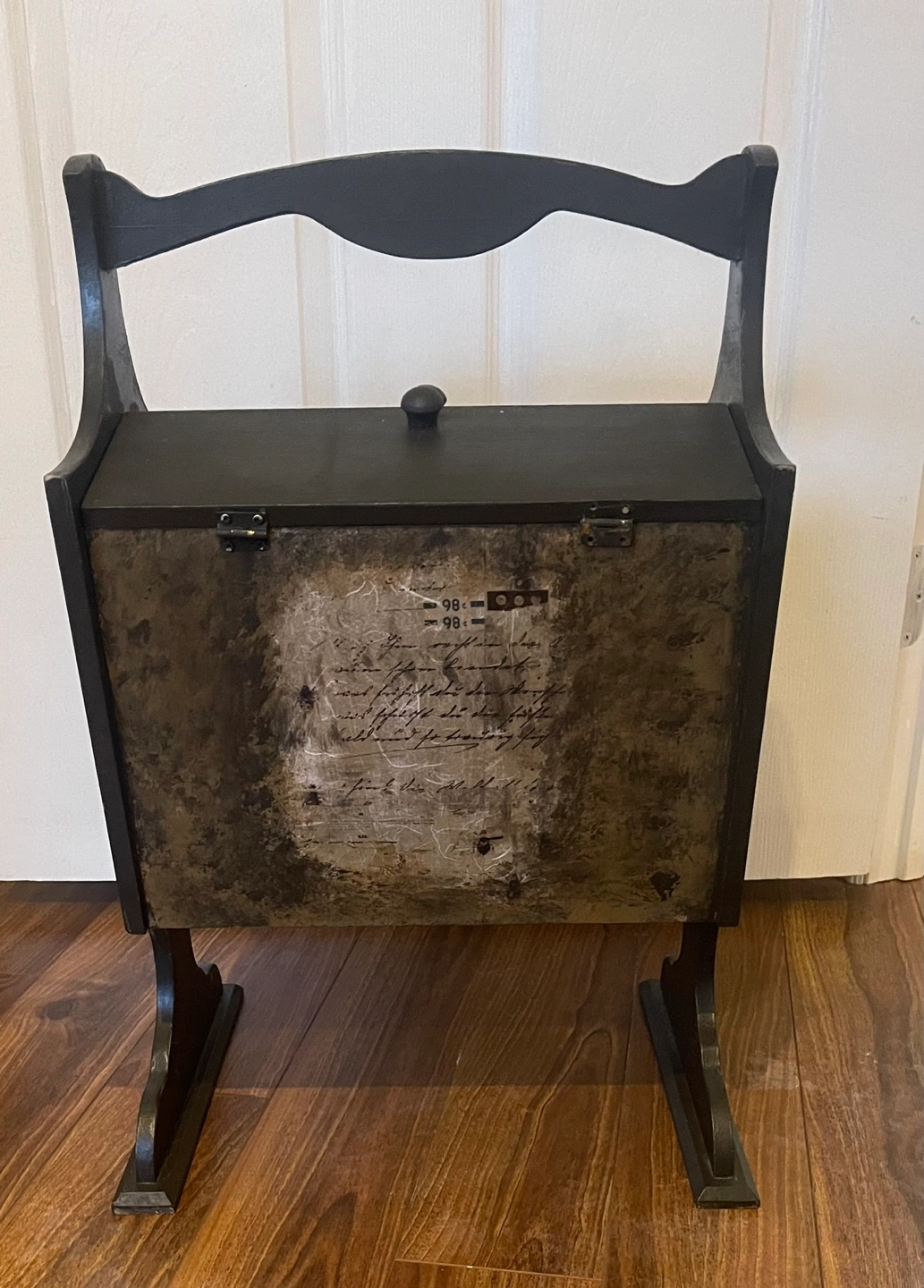 33Dark stained wooden magazine rack. Features a hinged top and small feet. Unique distressed design on the front panel. Suitable for newspapers, magazines, or other storage.