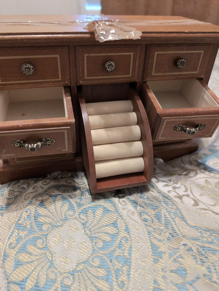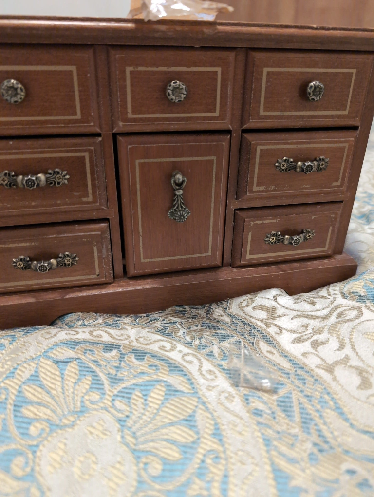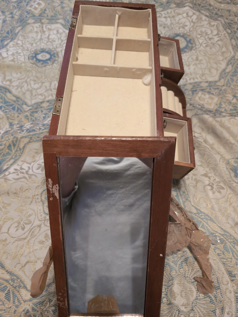 103Wooden jewelry box with multiple compartments, including a mirror and ring holder. Some wear and tear. Music box.