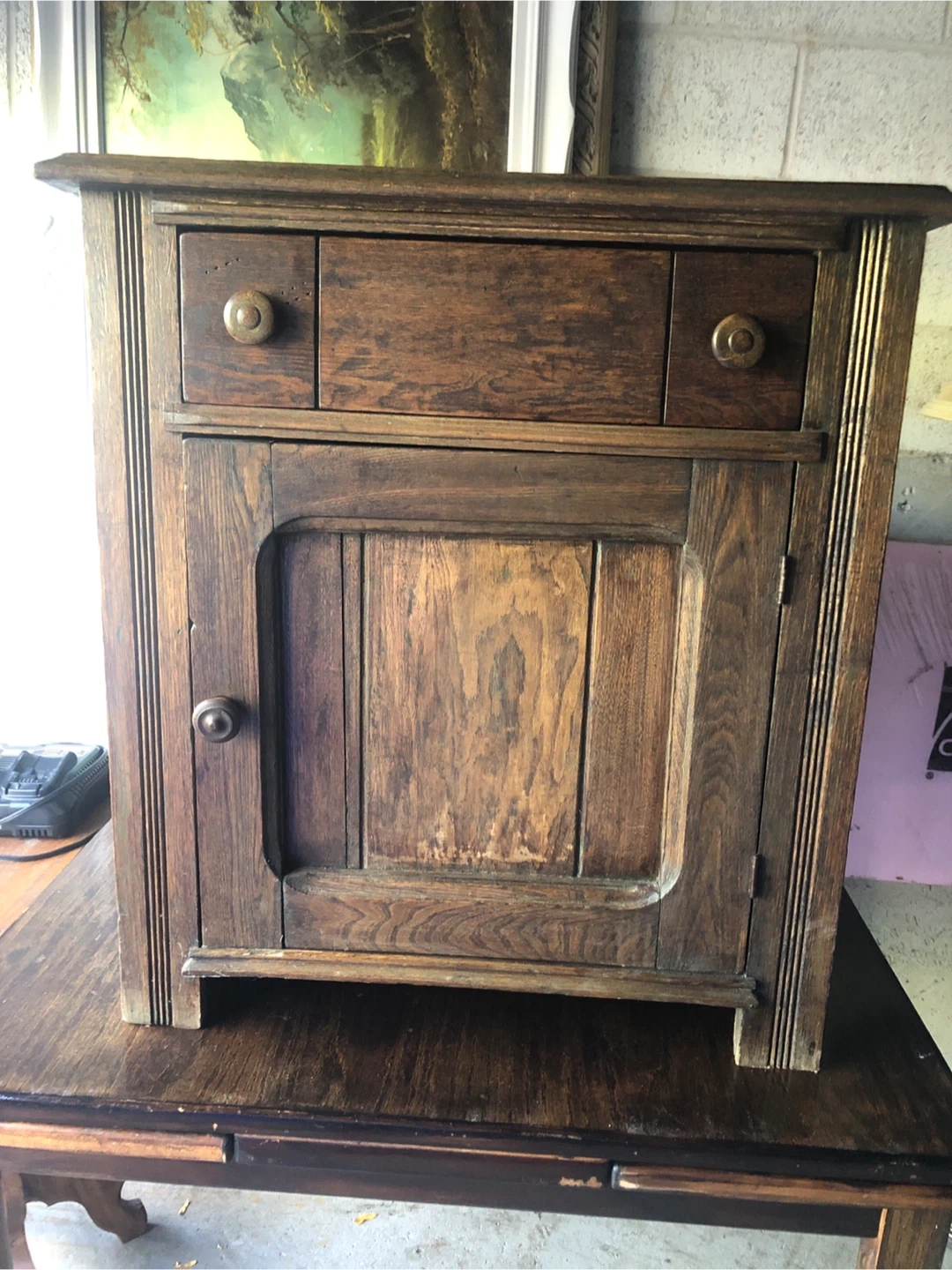 Selling a charming vintage wooden nightstand! It features a drawer on top and a cabinet with a door below, perfect for bedside storage. The wood has a lovely, aged patina that adds character to any room
