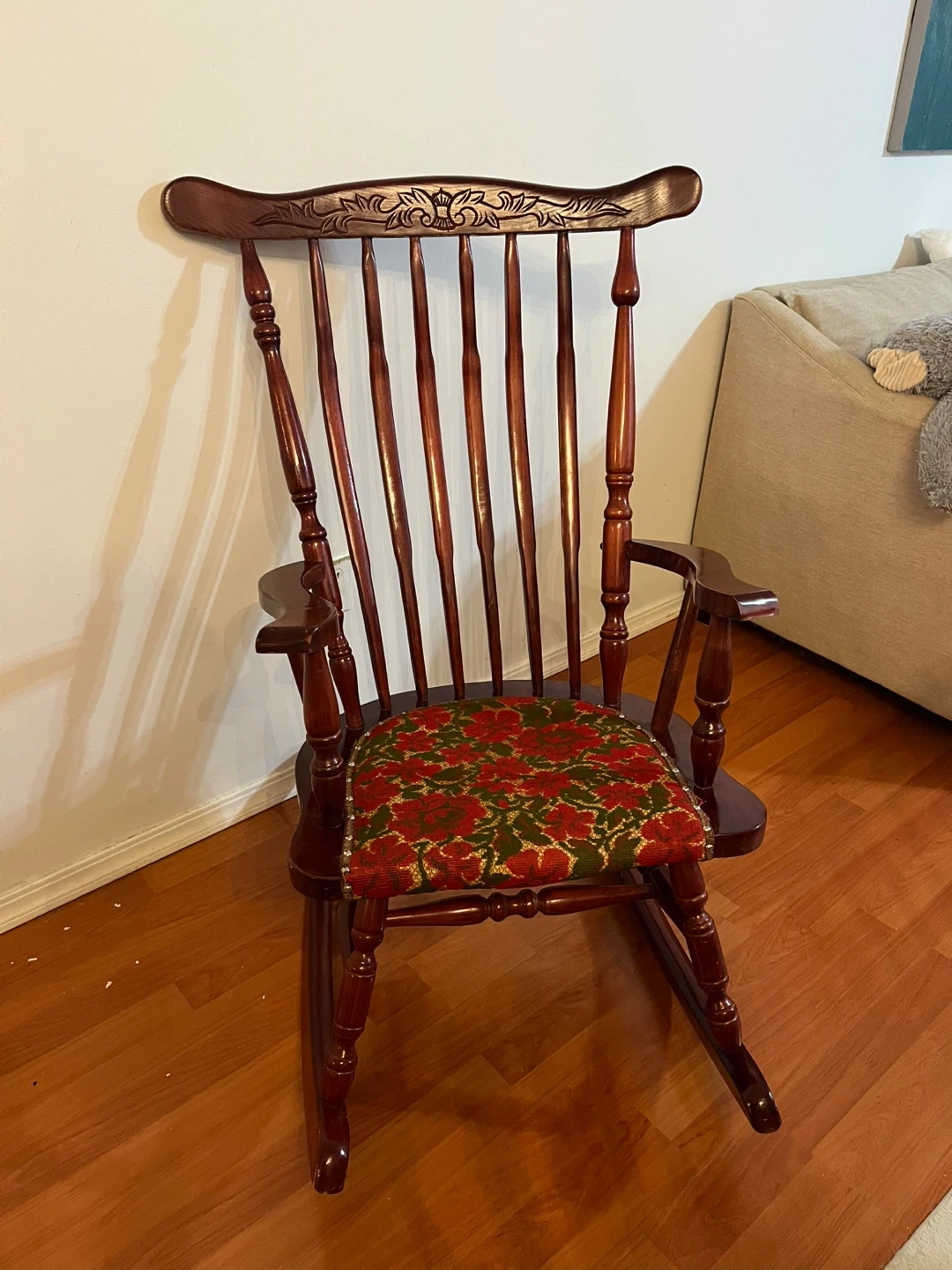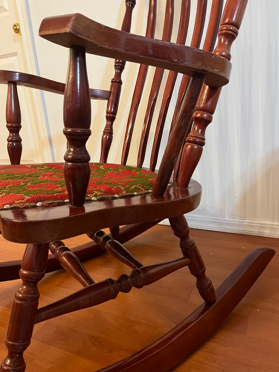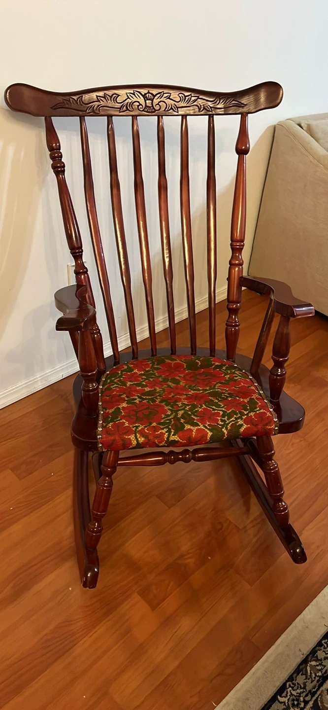 10Selling a vintage wooden rocking chair. Cherry wood stain in high quality. It's in good condition and has a floral patterned cushion. There are some signs of wear on the base, as shown in the pictures. Doe to not having spaces am selling it. Pick up at North Burnaby.
