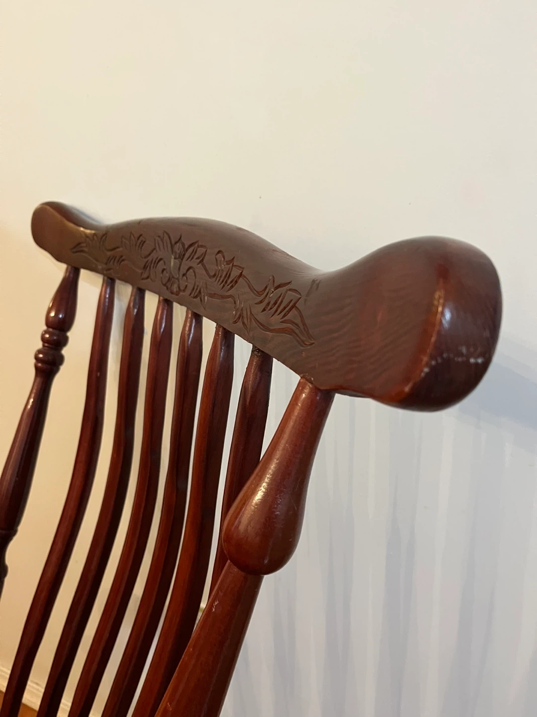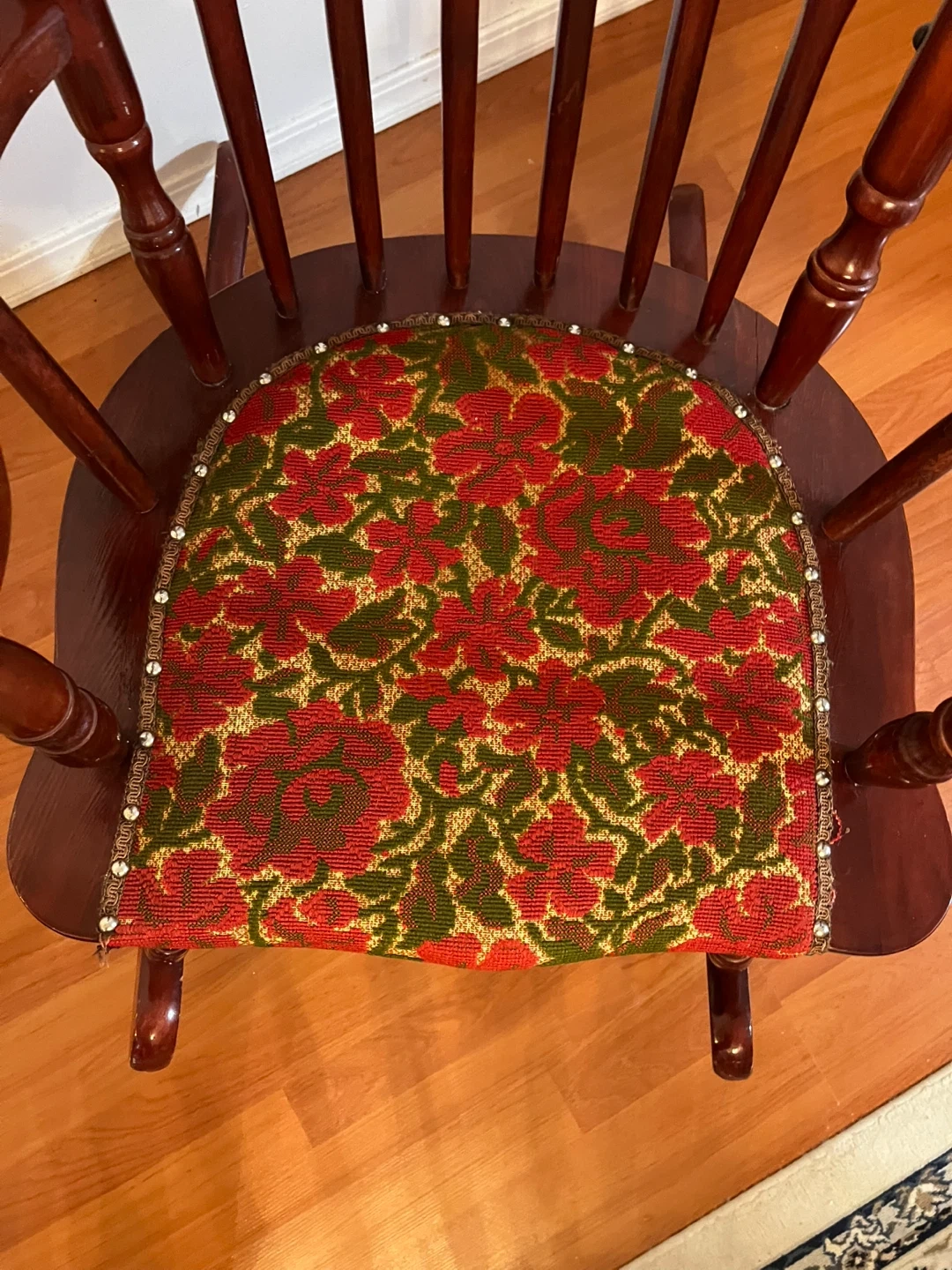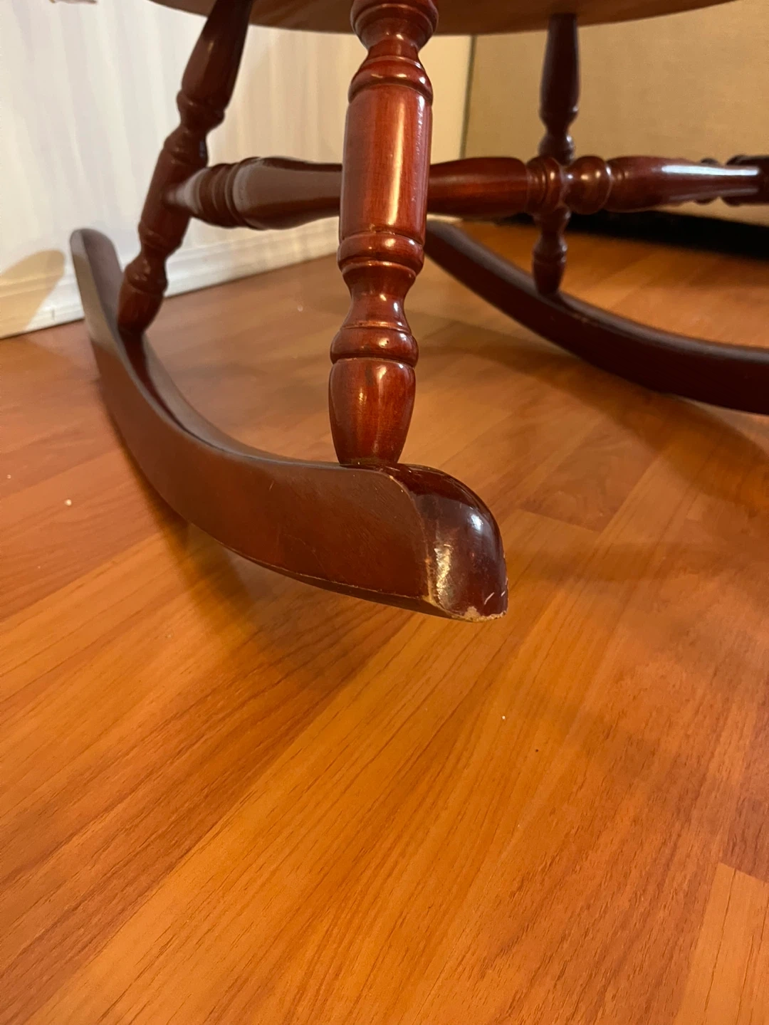 10Selling a vintage wooden rocking chair. Cherry wood stain in high quality. It's in good condition and has a floral patterned cushion. There are some signs of wear on the base, as shown in the pictures. Doe to not having spaces am selling it. Pick up at North Burnaby.