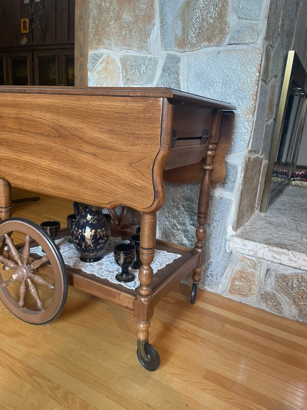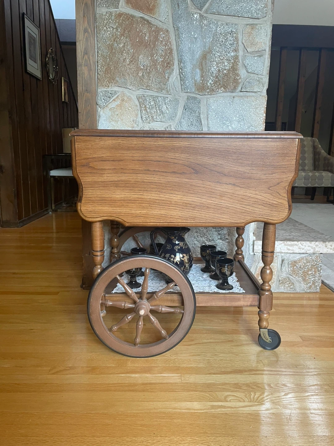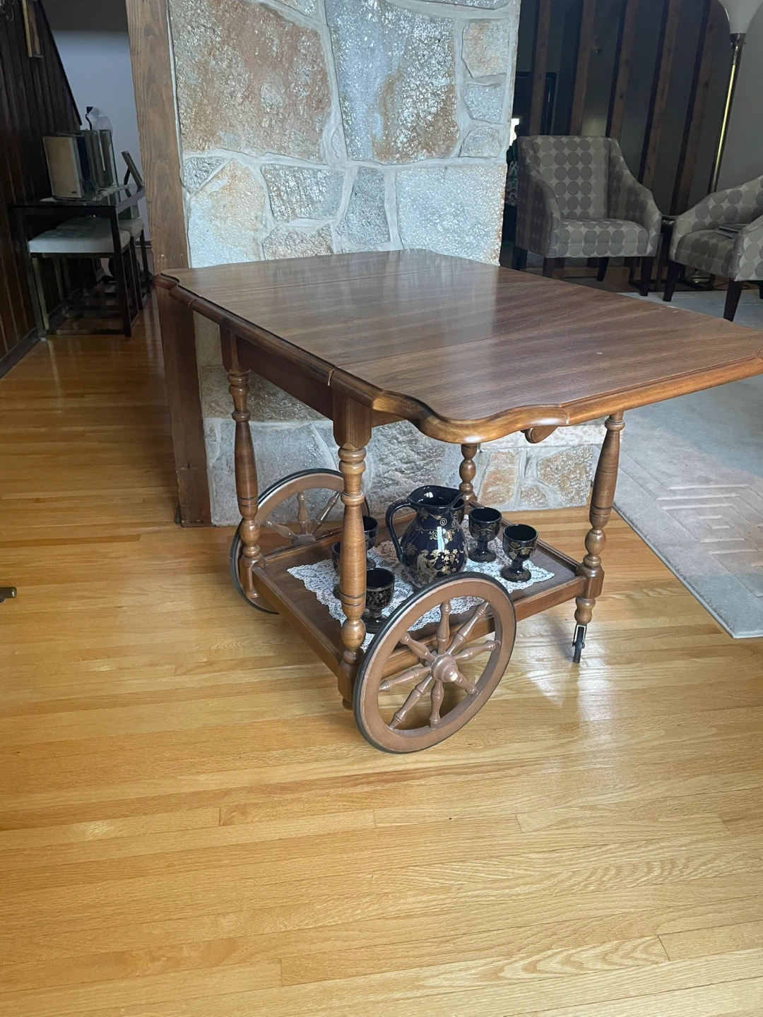 Selling a charming vintage wooden tea cart! It features a unique wheel design, side leaves for up and down for extra space and easy storage. Perfect for adding a touch of retro elegance to your home. Would be a great upcycle too! 27 wide x 29 high x 20 deep (without leaves) 39 with leaves Pick up in East Kildonan, cash please