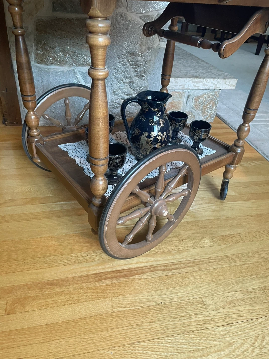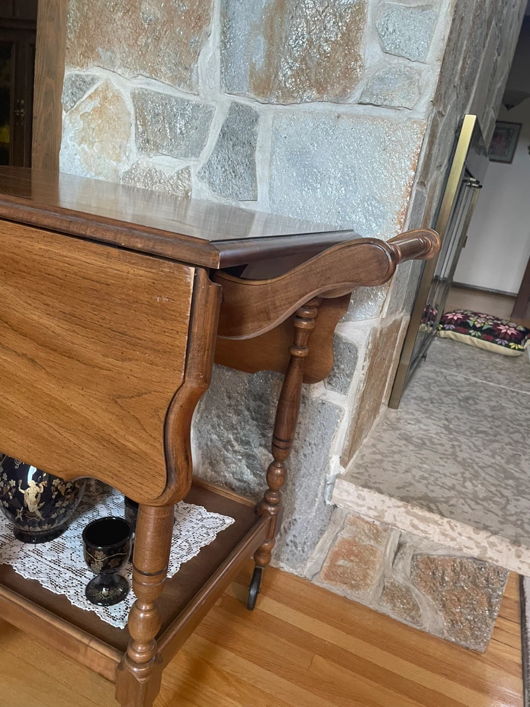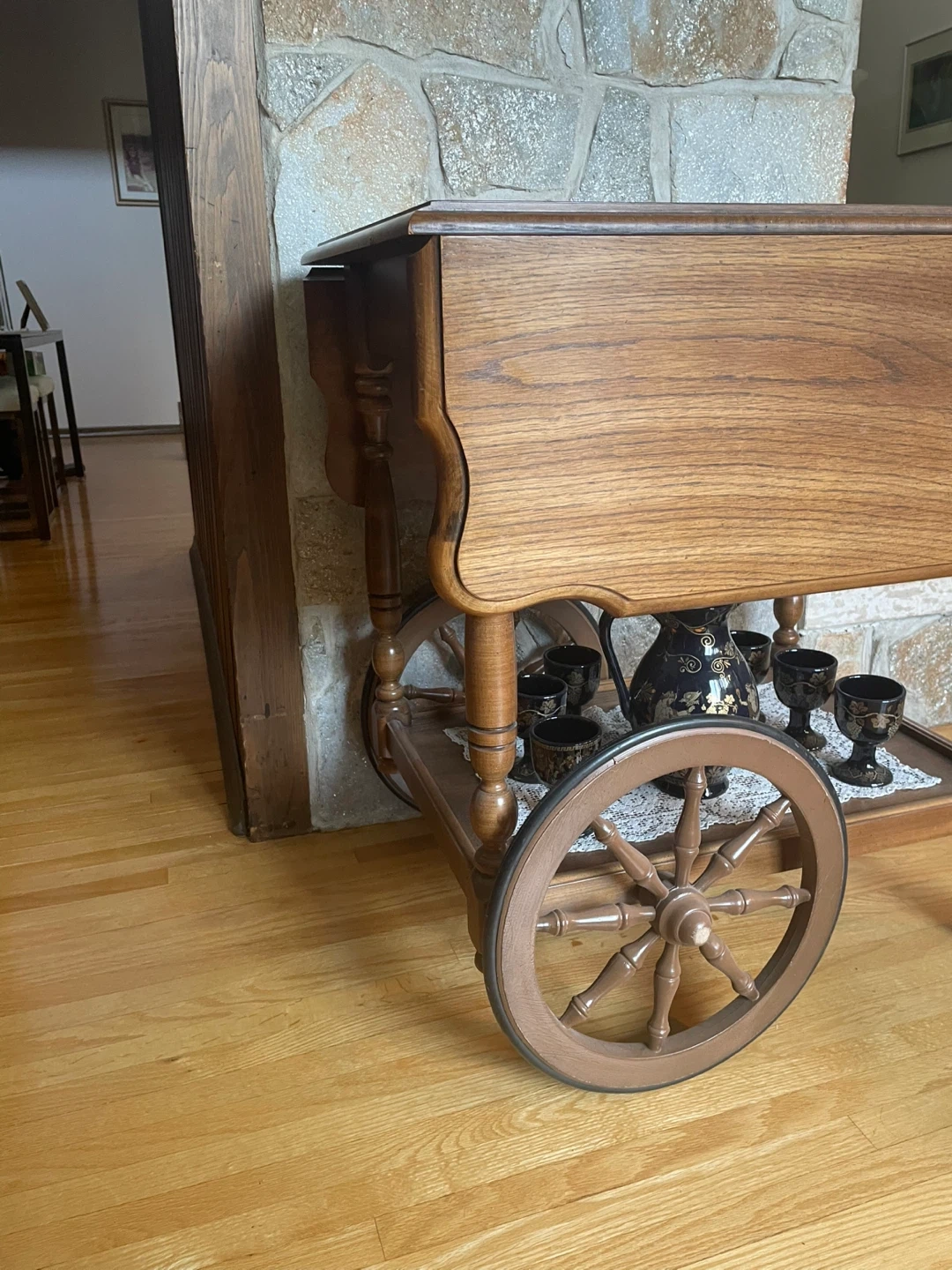 Selling a charming vintage wooden tea cart! It features a unique wheel design, side leaves for up and down for extra space and easy storage. Perfect for adding a touch of retro elegance to your home. Would be a great upcycle too! 27 wide x 29 high x 20 deep (without leaves) 39 with leaves Pick up in East Kildonan, cash please