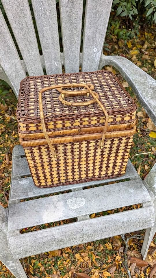 170Beautiful vintage woven rattan basket with lid and sturdy double handles. Features a classic two-tone natural and dark brown cane weave with solid construction and great texture. Perfect for use as a picnic basket, storage basket, or decorative home accent. Details: Material: Natural wicker/rattan and cane Color: Warm honey + dark brown two-tone weave Size: Approx. 10” L × 13” W × 14” H Use it for: ✔ Picnics, blankets, craft or toy storage ✔ Boho or cottagecore home decor ✔ Prop styling or photography Pick up in Burlington. Etransfer to hold, or same day pickup. Cash or etransfer.