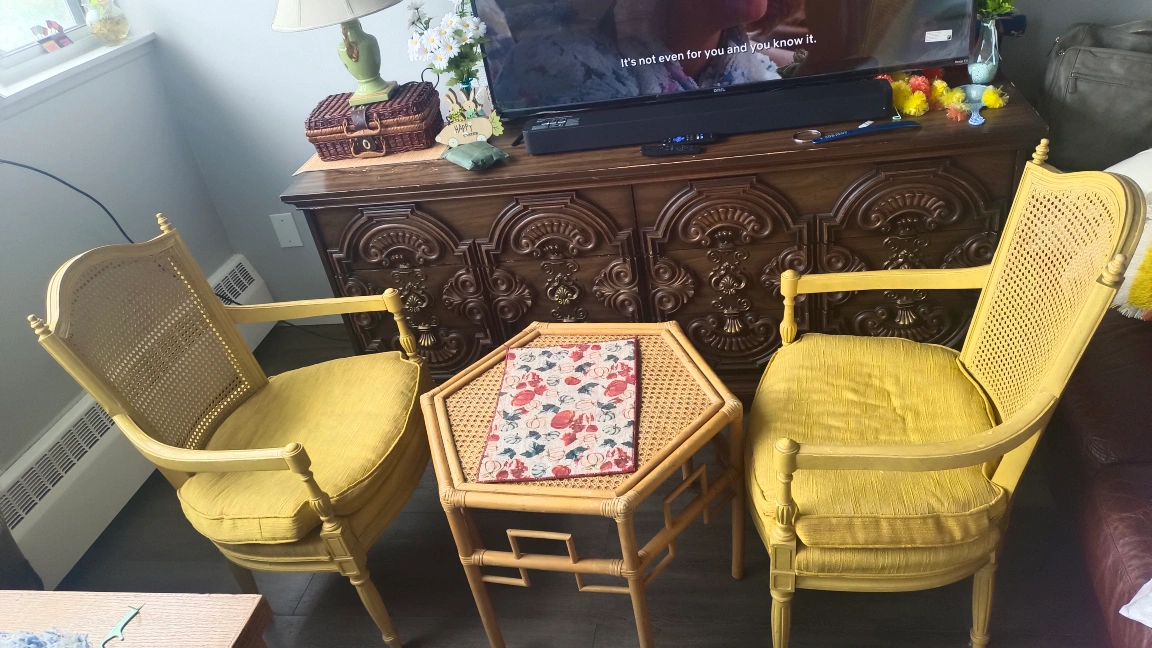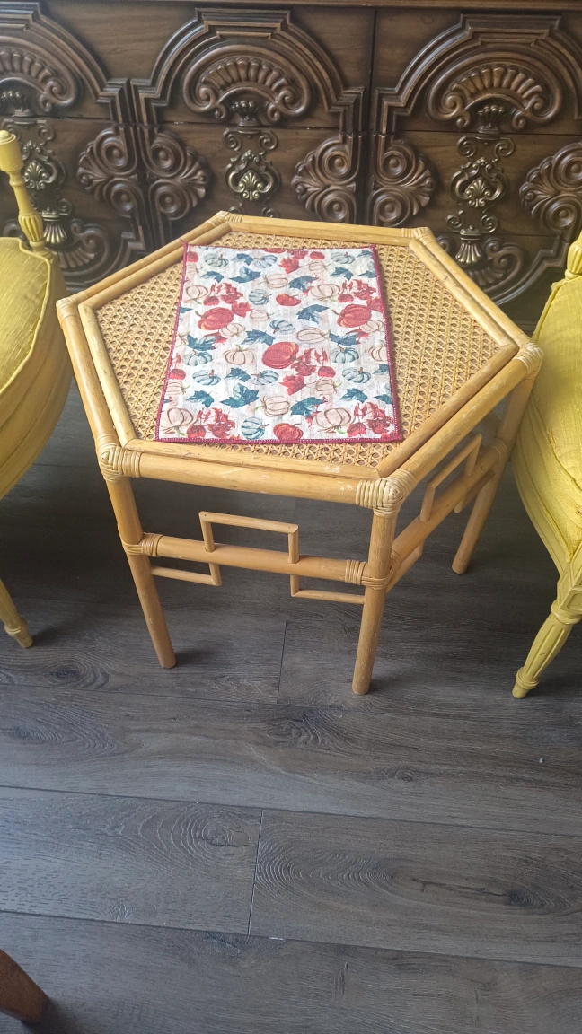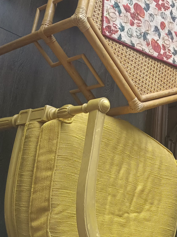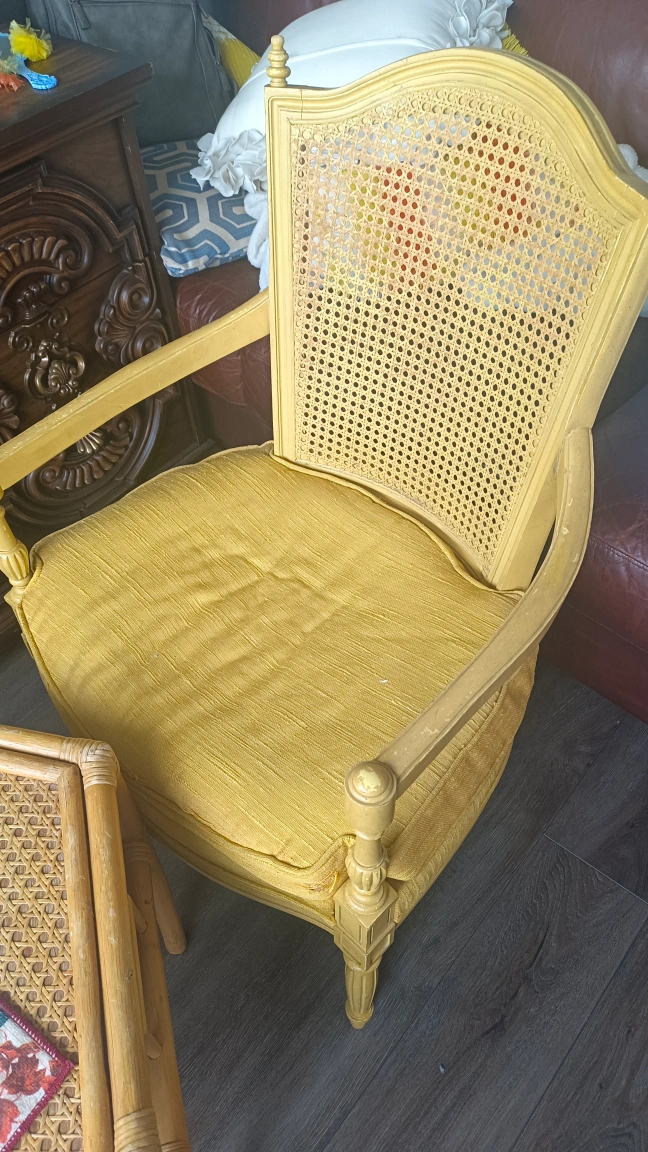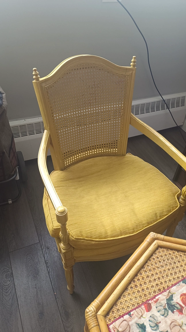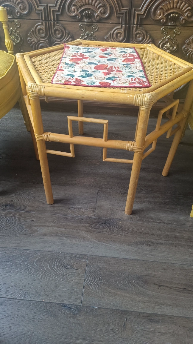 10Selling a cute vintage accent chair with a matching side table. The chair has a lovely yellow cushion and a rattan back. The side table is also rattan with a decorative fabric top. Perfect for adding a touch of vintage charm to your home!