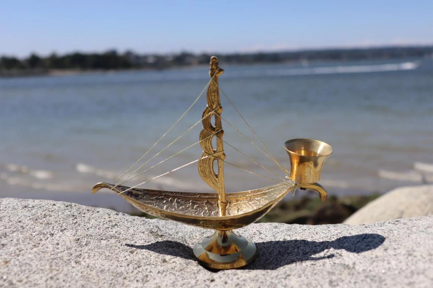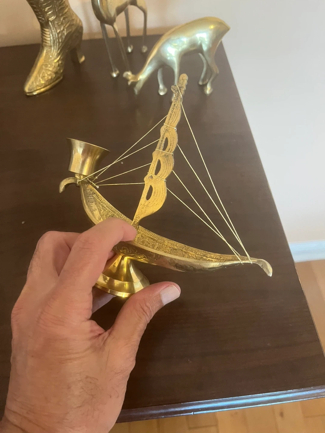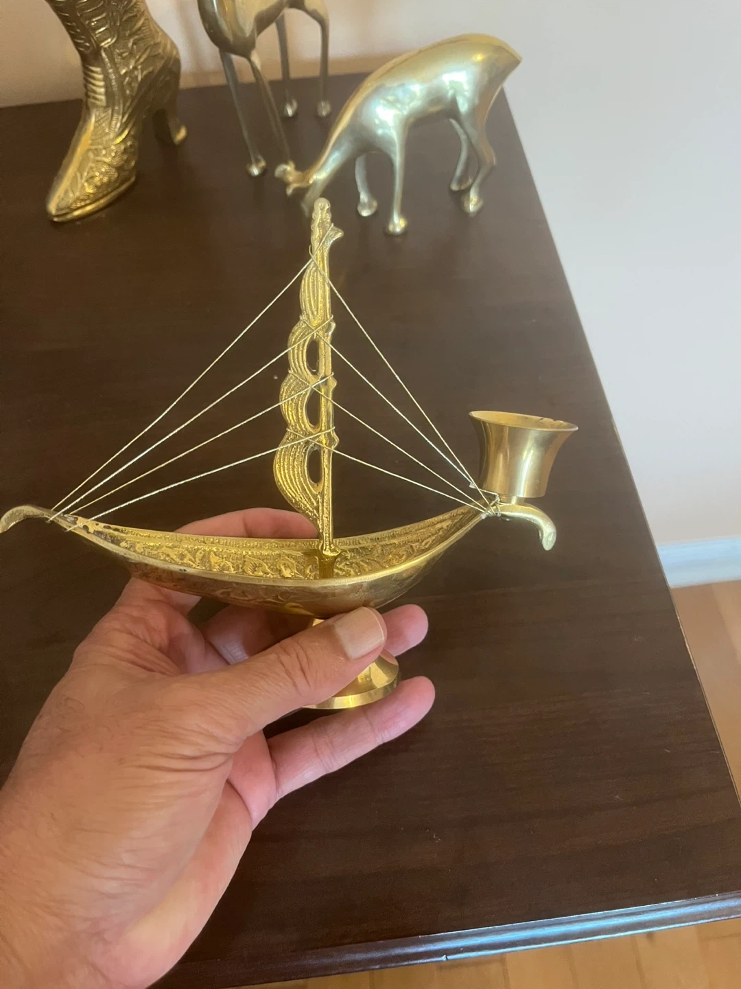 Petals yellow brass Selling a vintage Viking ship candle holder. It's in great condition and would make a unique addition to any home decor! This piece features a detailed ship design with a candle holder at the stern. Perfect for adding a touch of nautical charm to your space