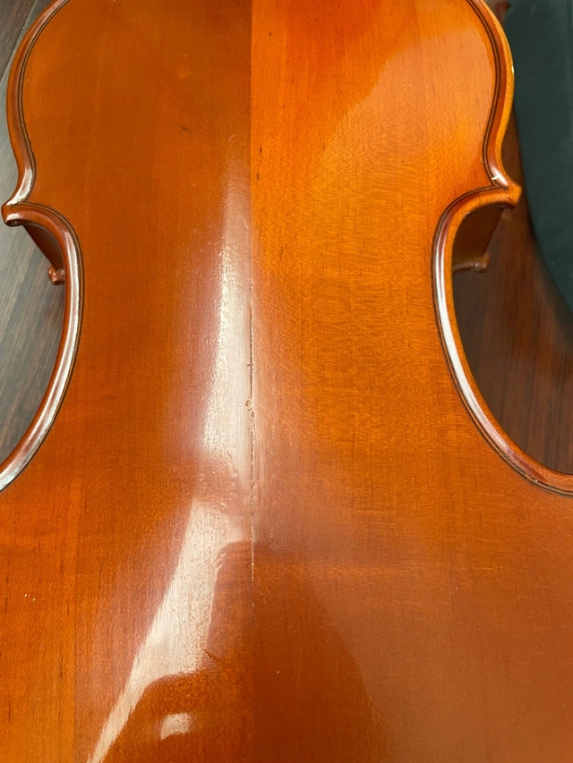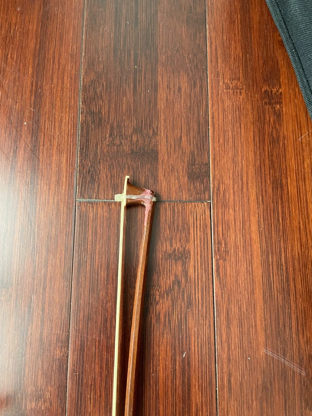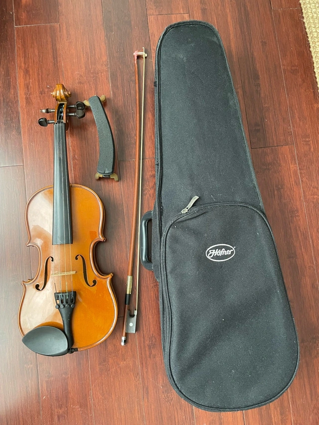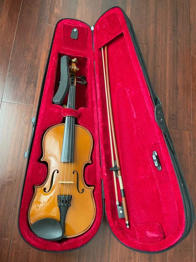 Violin for learning size 1/2 or 50cm come with shoulder pad and case, fixed broken bow but still works, if you need to be perfect just buy a new bow. If the ads still on, it's available.