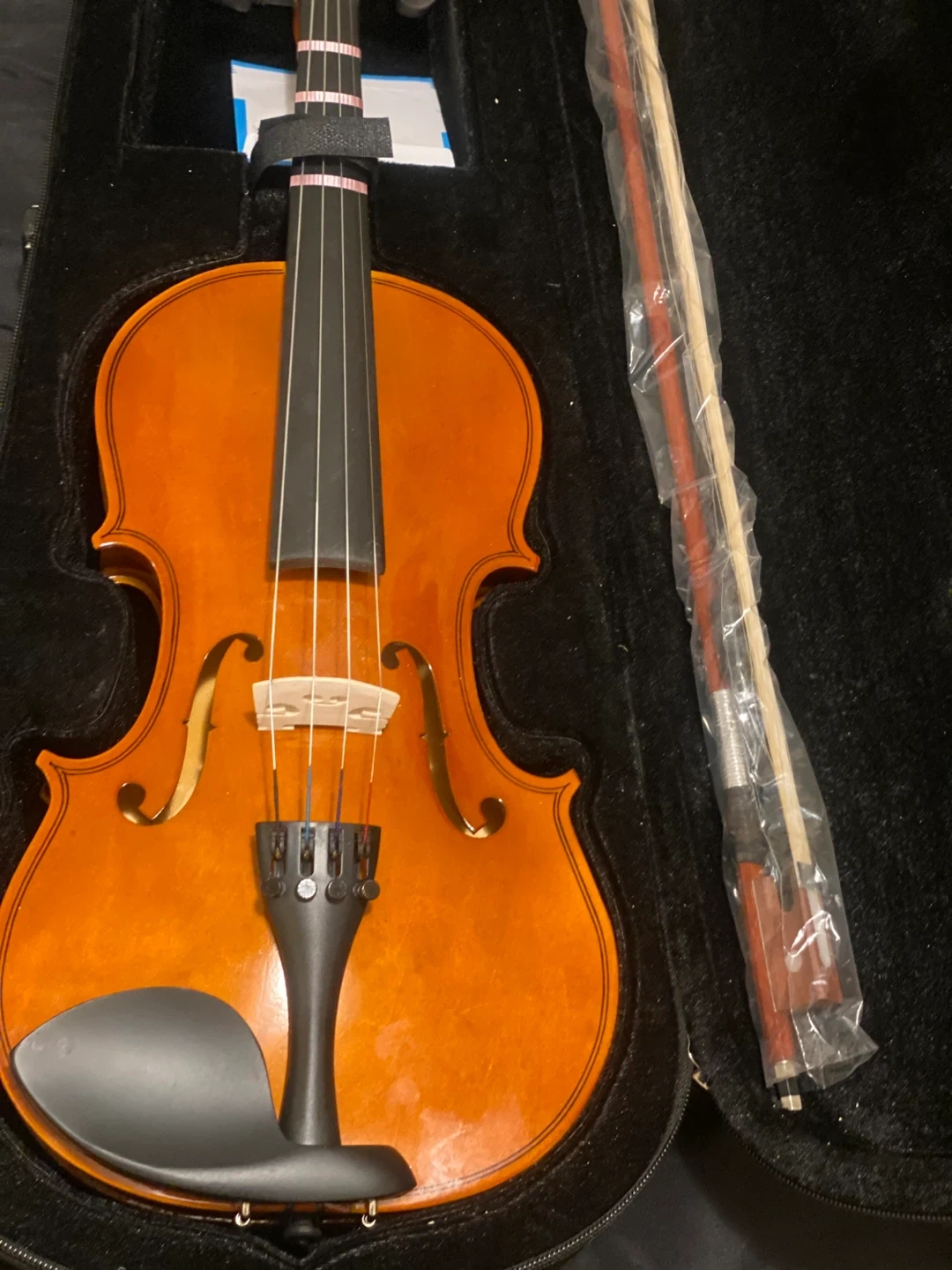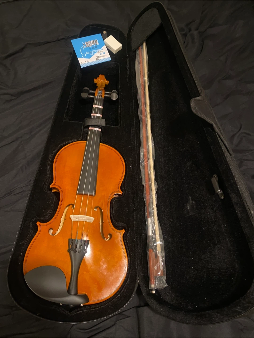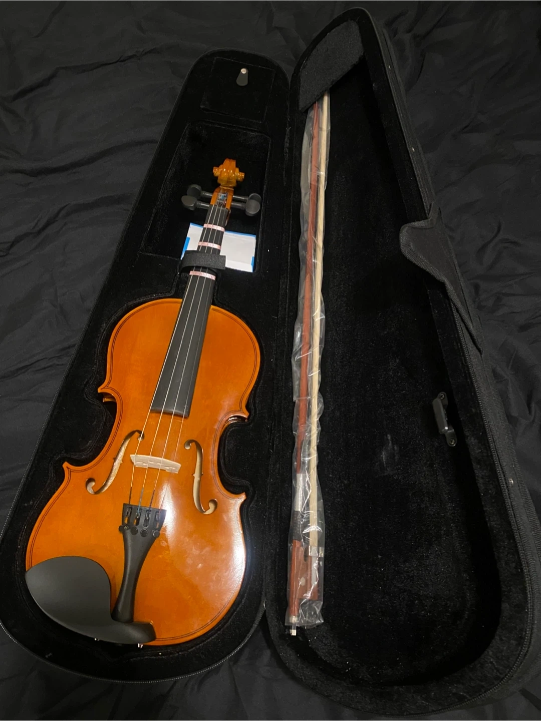 18Model: 4/4 Full-Size Violin Color: Natural wood finish Condition: Gently used — in excellent condition, no cracks or major scratches. Fully functional and well cared for. Size: 4/4 (Full Size) Includes: Violin, bow, rosin, and hard case Materials & Features: Solid wood body with smooth varnish finish, ebony fingerboard, and durable strings.