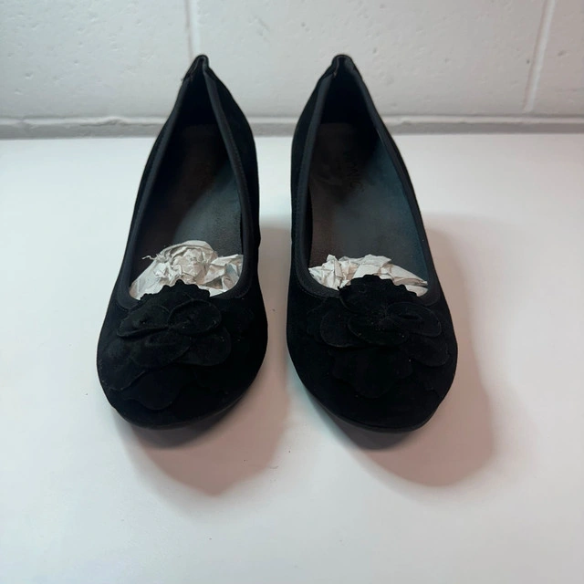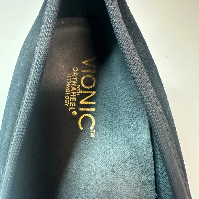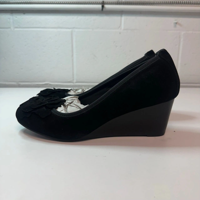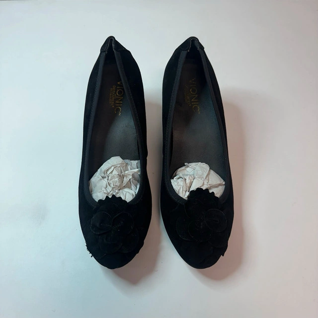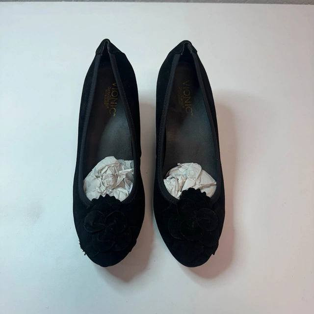 Brand new Vionic women’s wedge pumps in classic black faux suede, featuring a chic flower detail on the toe. Designed with Vionic’s Orthaheel® Technology for superior arch support and all-day comfort. Perfect for both professional and casual outfits. • Brand: Vionic • Model: Orthaheel Technology • Condition: New without box • Color: Black • Upper Material: Faux Suede • Style: Wedge heel pumps with floral accent • Heel Height: Mid wedge • Size: US 9 • Comfort: Built-in arch support and cushioned insole For Sale By: Owner