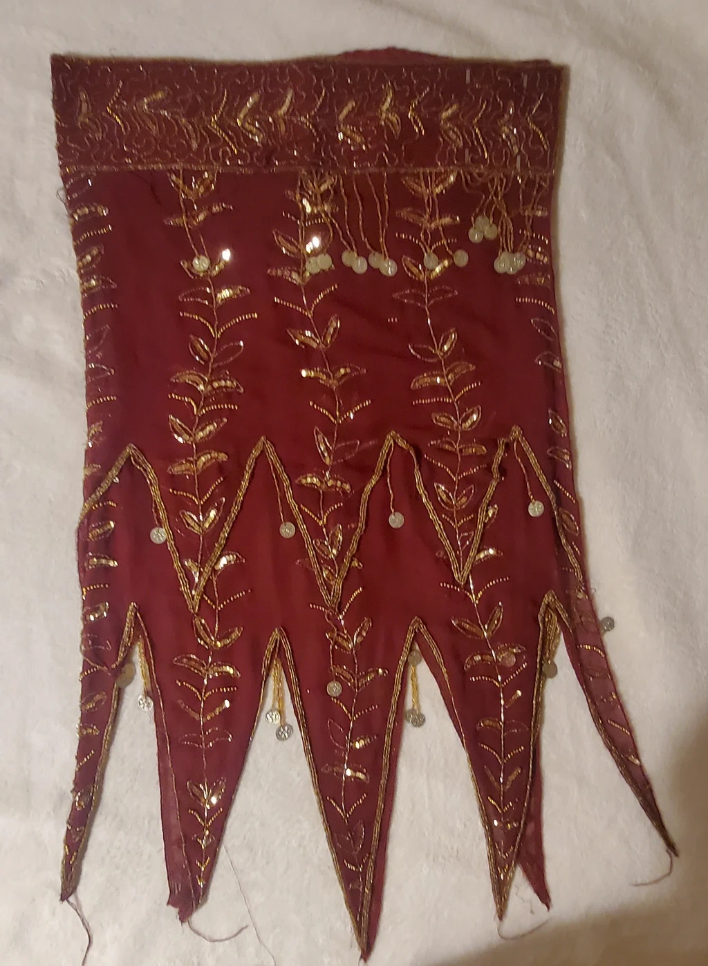 Starfish bra and matching skirt. This is a very well made outfit. Deep red (wine) coloured with tons of gold beading, very intricate. Bra is padded. The last picture has the skirt inside out, to show that the clasp can accommodate slim and wide hips.