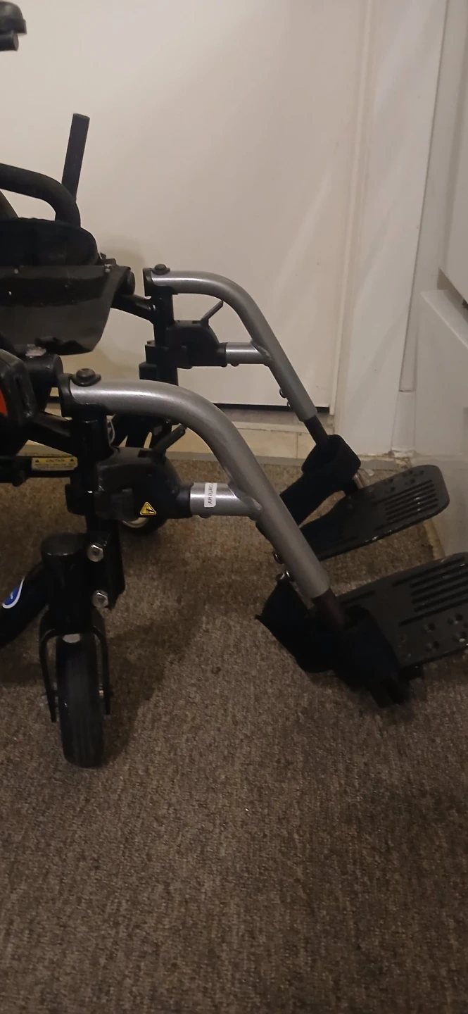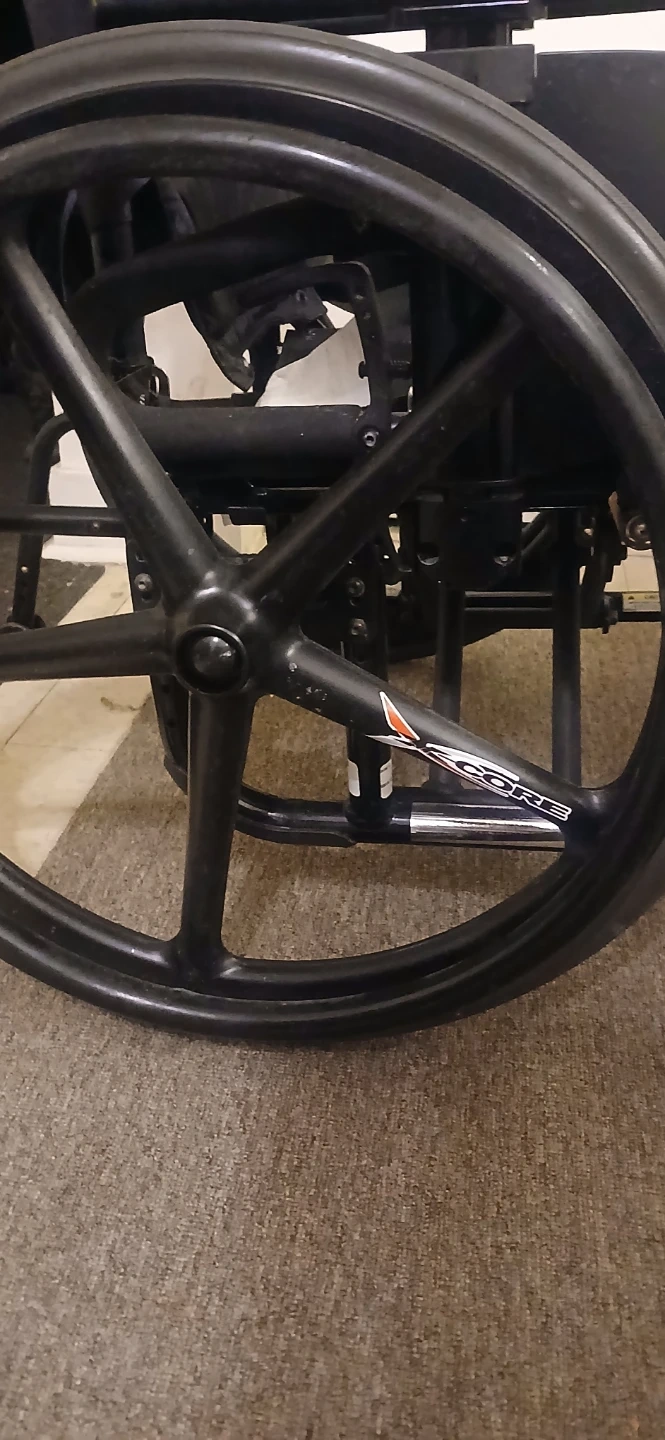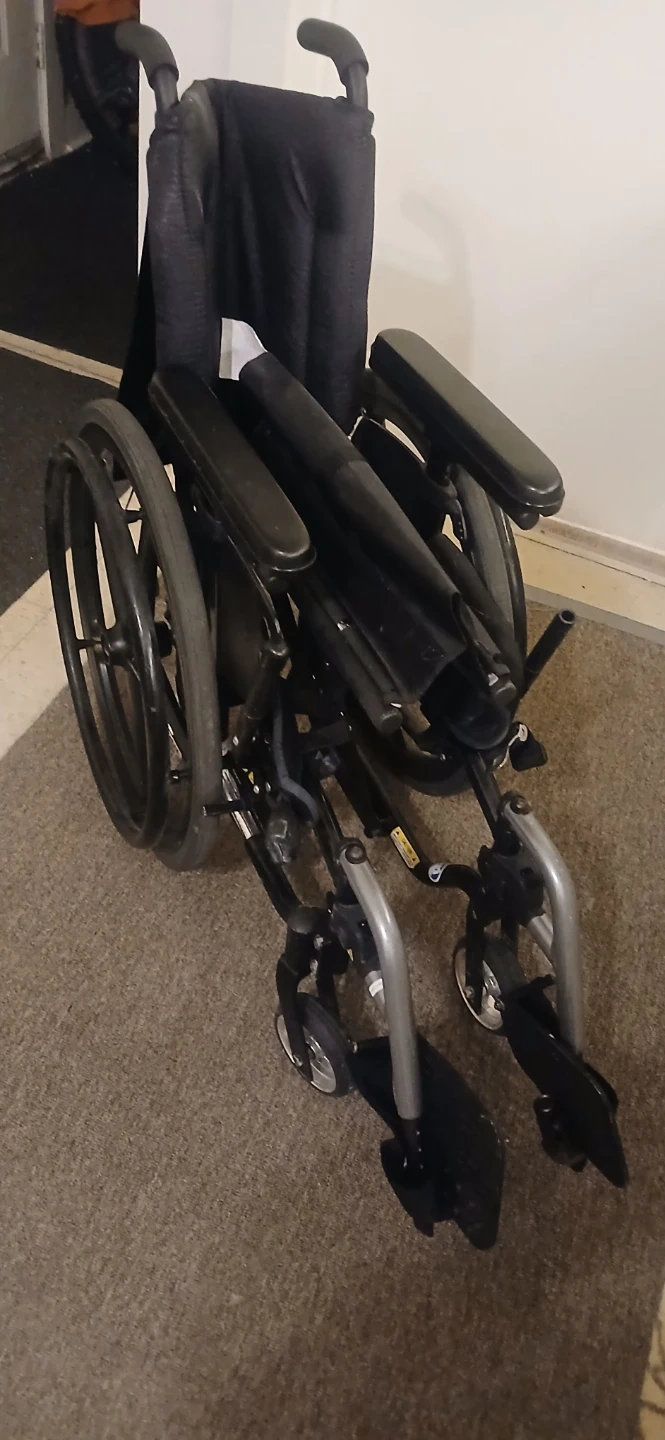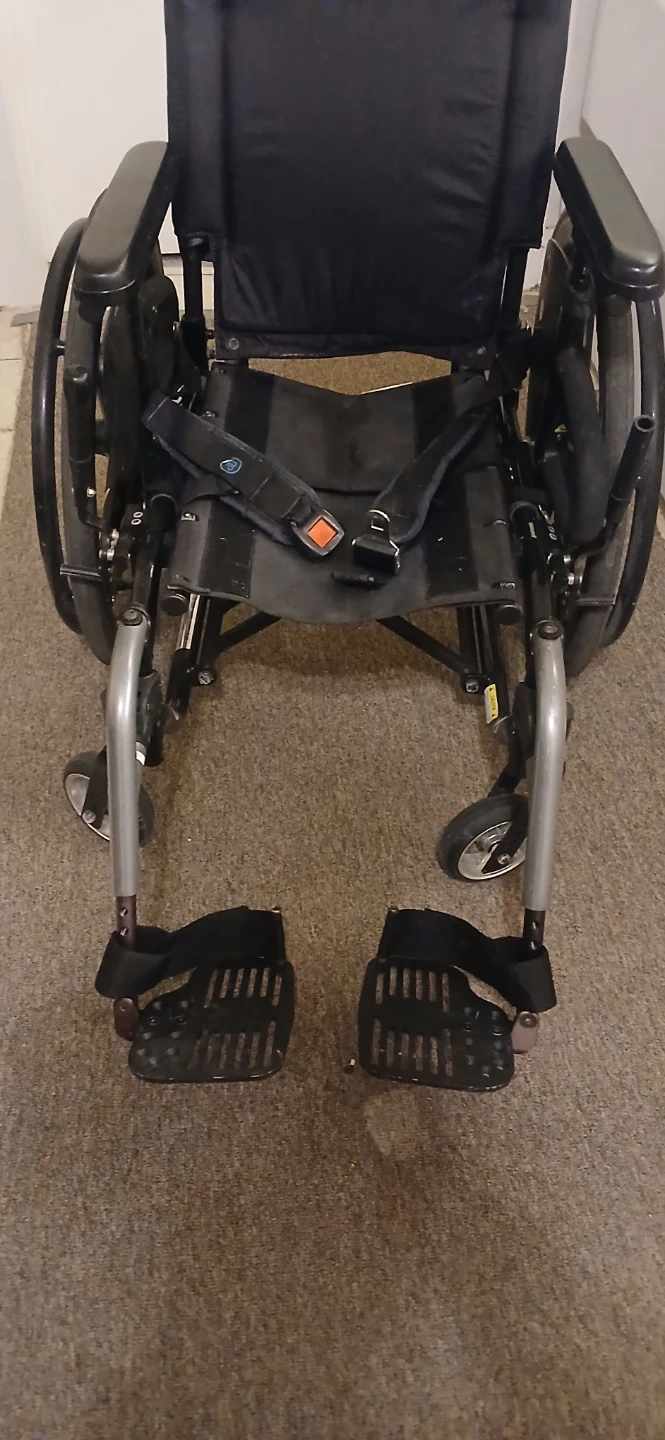 This is a lightweight Quickie Helium wheelchair. It's designed for easy transport and mobility. Comes with a seatbelt for added safety. This wheelchair would be useful for individuals needing assistance with mobility.