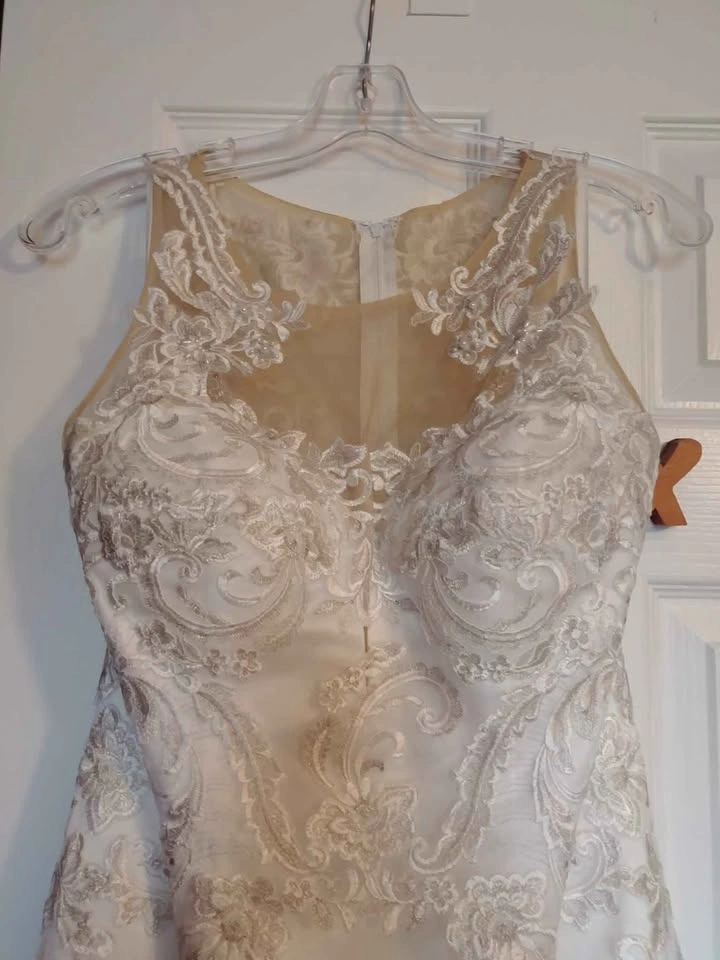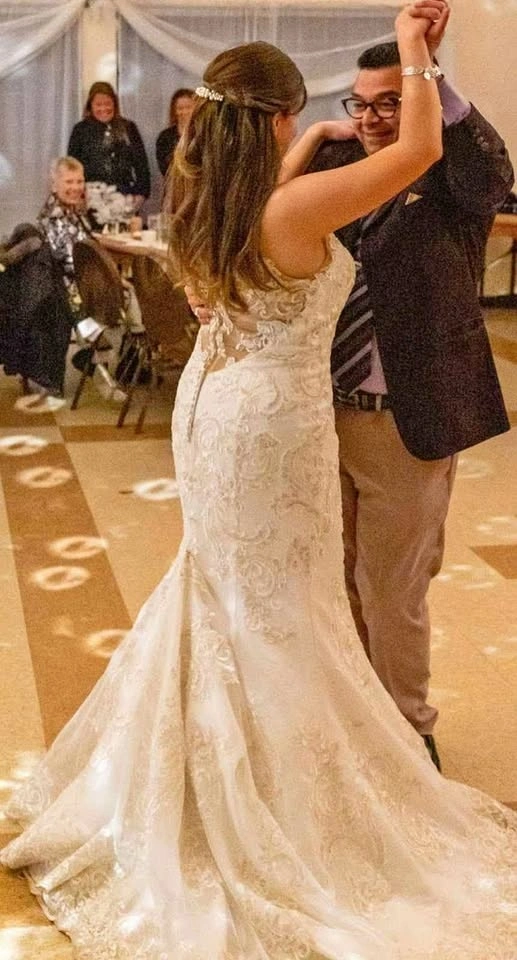 Stunning wedding dress! Size 12, mermaid fit with a beautiful train. Has a bustle hook for the train. Intricate lace floral design with delicate heirloom beadwork. Modest plunge neckline. Back has sheer lace and button closures. Inside has crinoline underskirt and silk lining.
