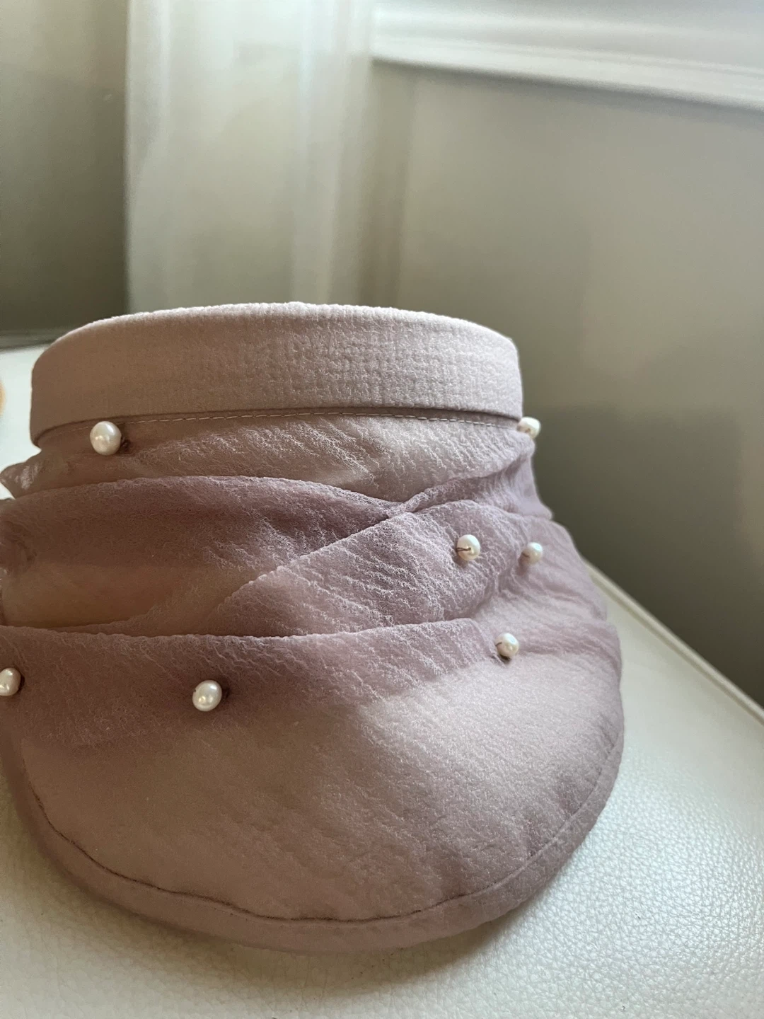 Selling a cute visor in a lovely lilac colour. It features delicate pearl detailing that adds a touch of elegance. Perfect for sunny days!