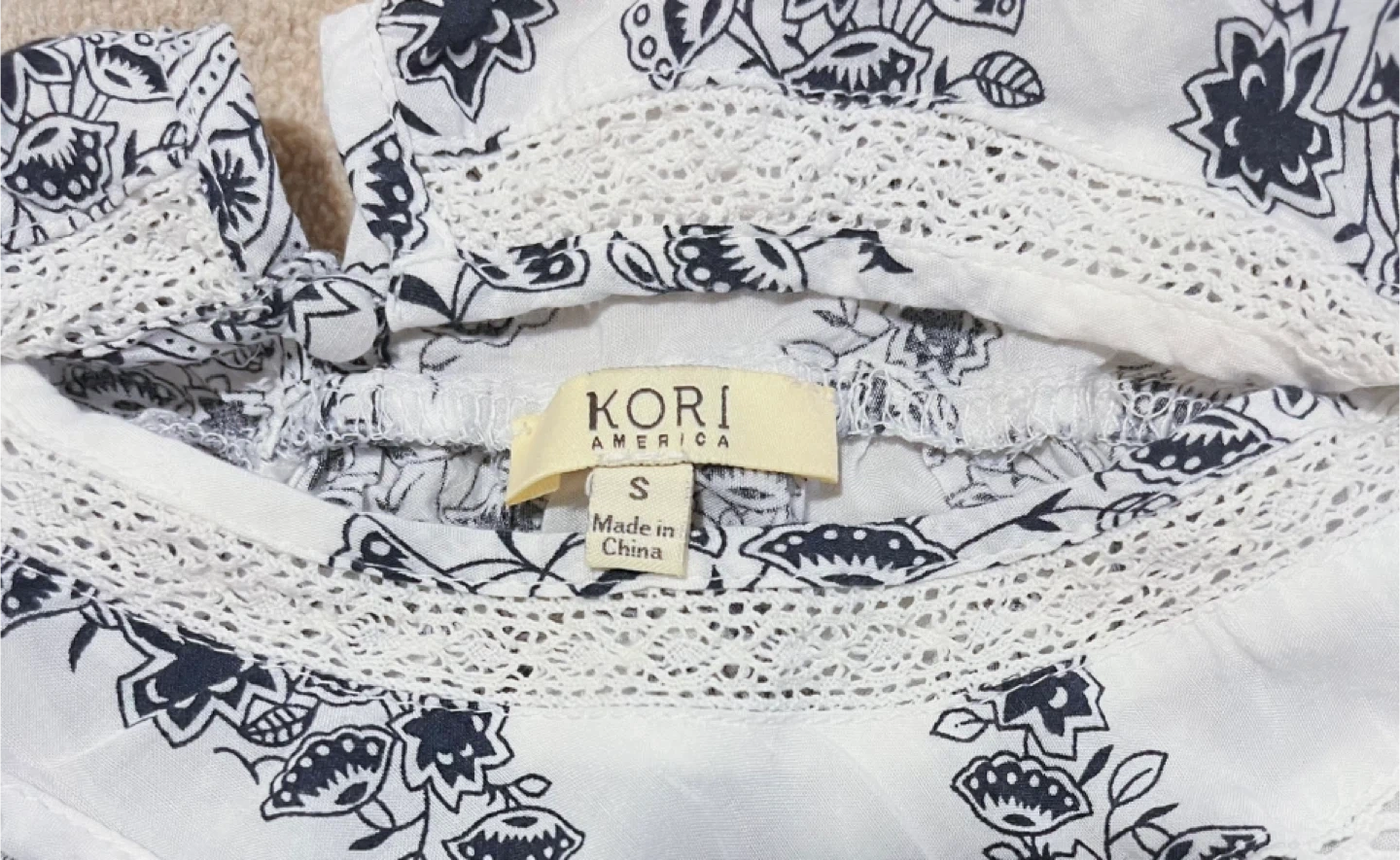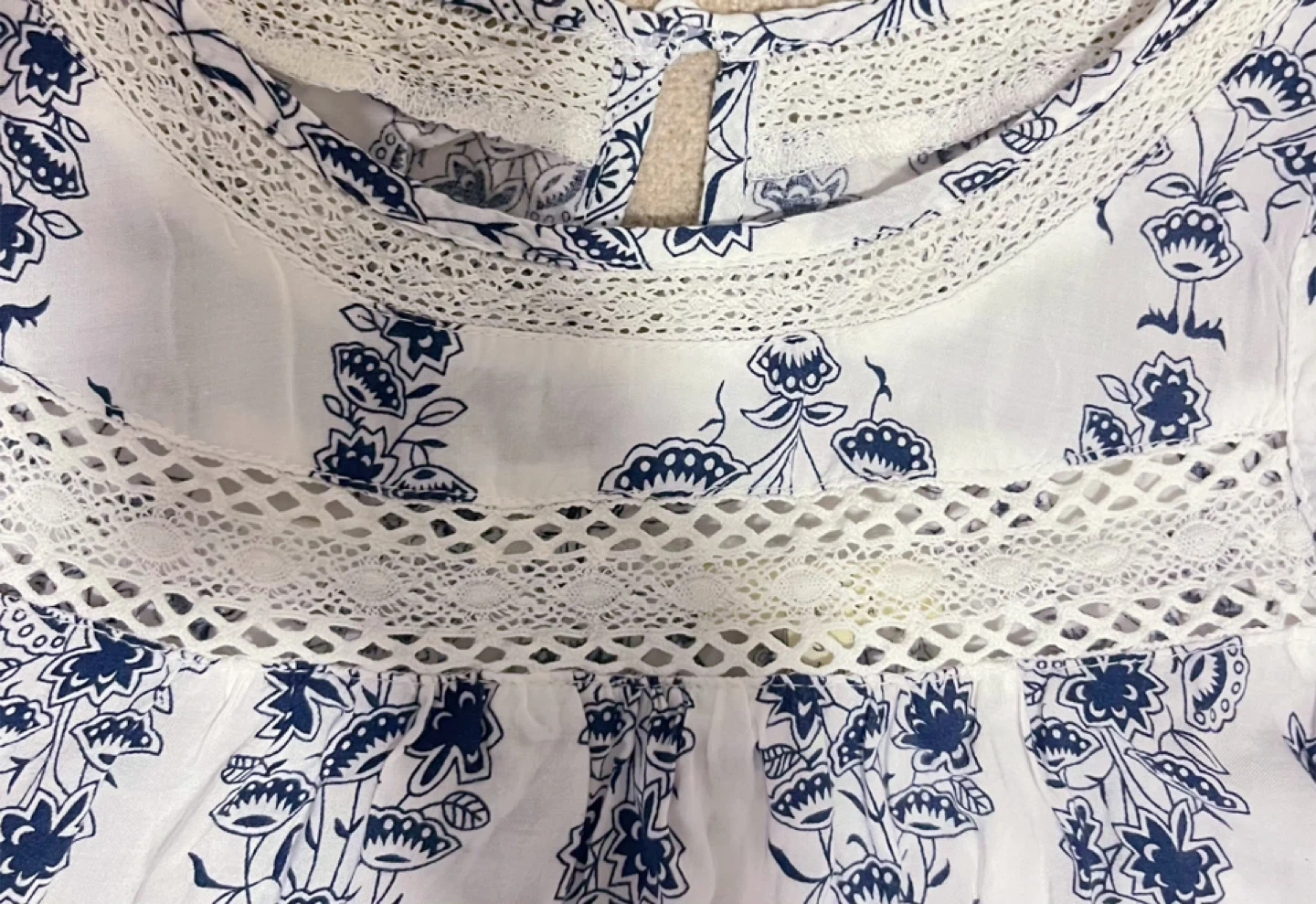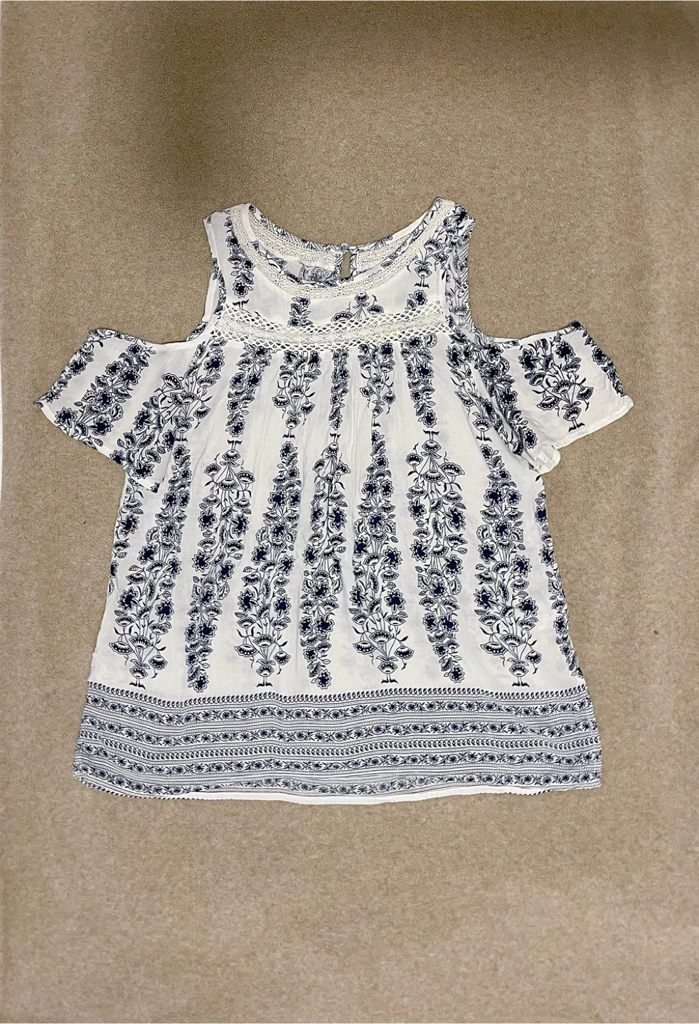 White top with navy blue floral print and white lace trim. Cold shoulder design with short sleeves. Size is small.