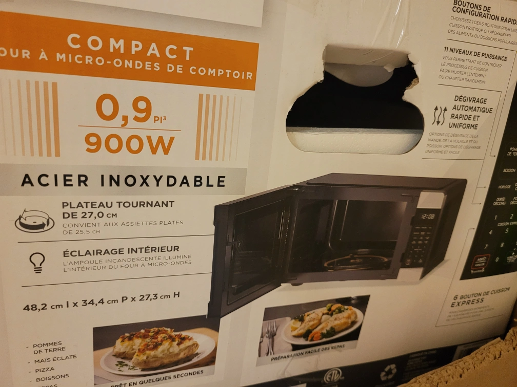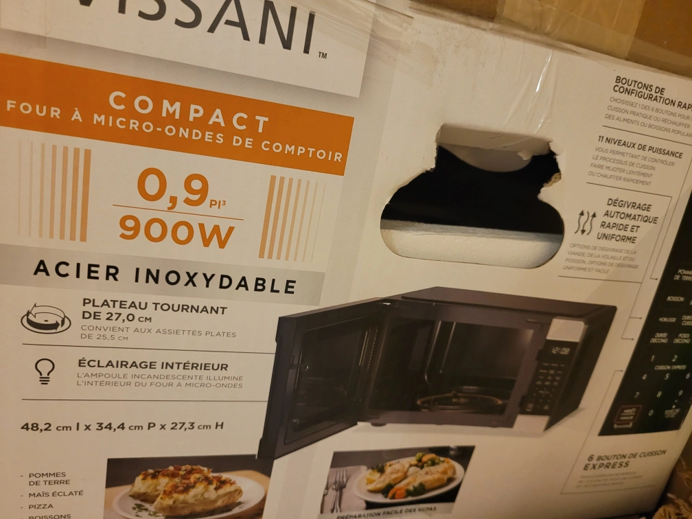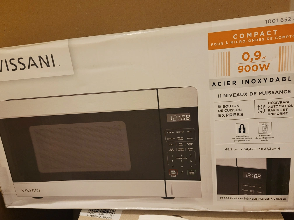 Selling a brand new Vissani compact microwave! It's still in its original box. Key features: - 0.9 cu ft capacity - 900W power - Stainless steel interior - Turntable of 27.0 cm (suitable for 25.5 cm plates) - Interior lighting - Dimensions: 48.2 cm (l) x 34.4 cm (p) x 27.3 cm (h) Has 6 express cook buttons and 11 power levels