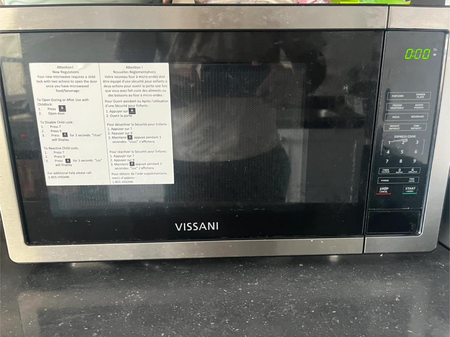 Selling a Vissani microwave in good condition. It features a child lock for safety and express cook options for convenience. It also has settings for popcorn, frozen vegetables, pizza, and more!