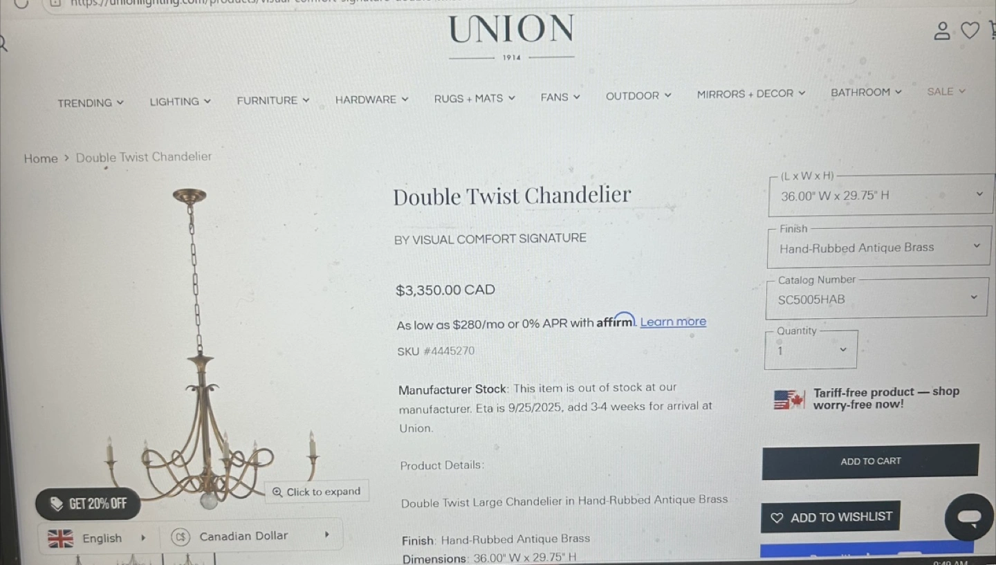 10Current price at Union Lighting is $3,349 + tax. https://unionlighting.com/products/visual-comfort-signature-double-twist-chandelier 36”W x 29.75”H In great condition. Price is firm. Can deliver if location is in midtown Toronto.