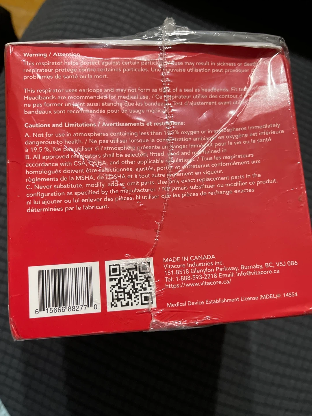 128Selling a brand new, sealed box of Vitacore CAN95e particulate respirators. These are made in Canada and provide ≥95% filtration. Each box contains 30 earpiece respirators. Stay safe and protected! Pick up at Islington avenue /401, bergamot I accept only cash . If you see the add it’s available