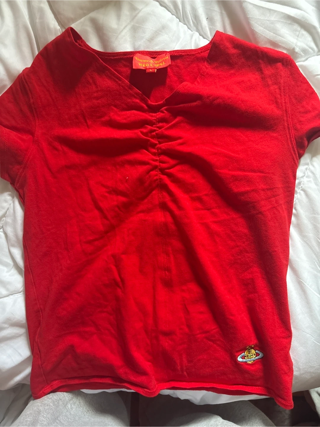 A vibrant red top from Vivienne Westwood's Red Label line! This top is a size L and features a unique gathered detail at the front. Perfect for adding a pop of colour to your wardrobe