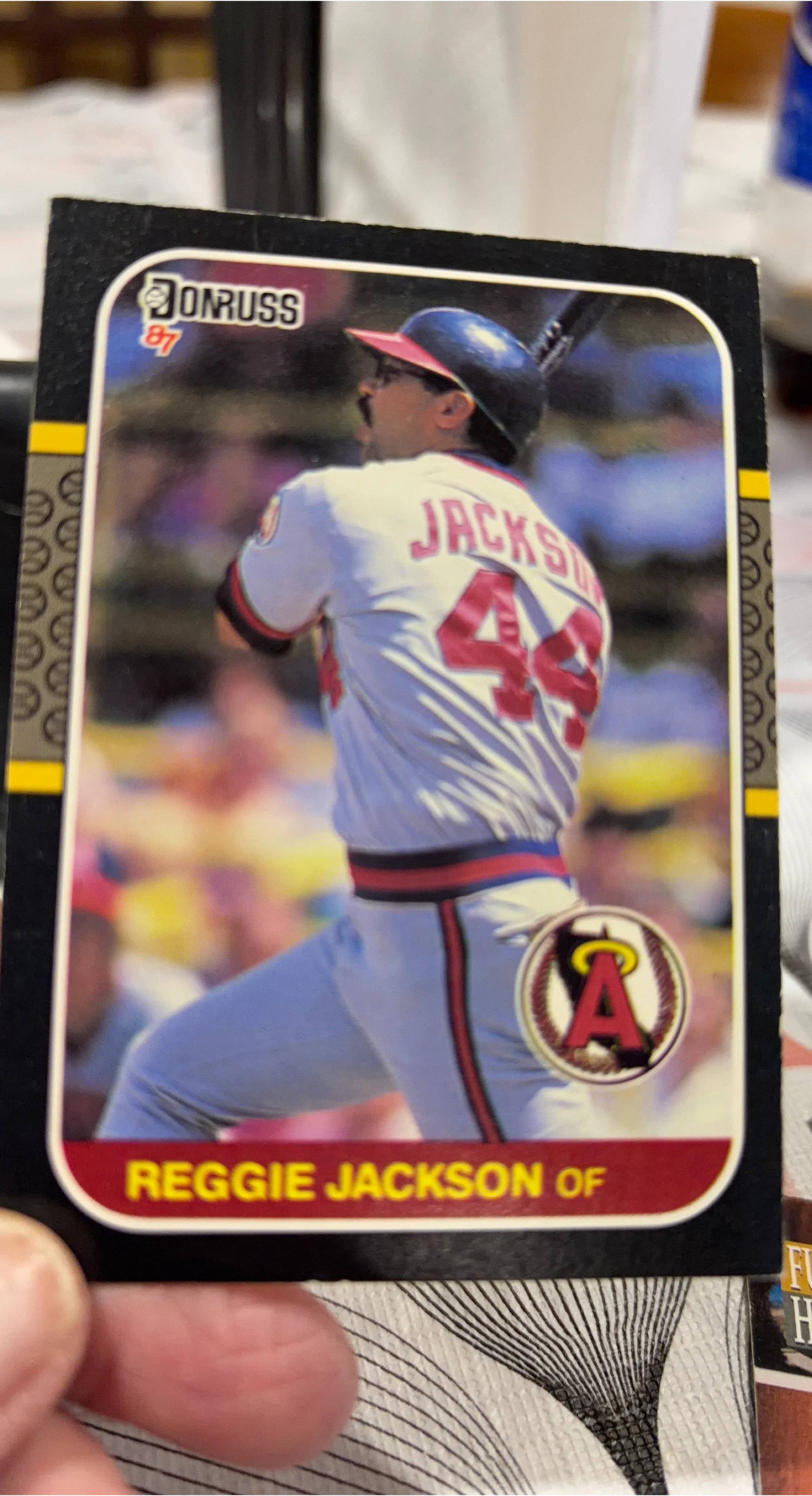This is a 1987 Donruss baseball card featuring Reggie Jackson. The card shows Reggie Jackson in his California Angels uniform. It's a classic collectible for baseball fans. This card is a great addition to any sports memorabilia collection!