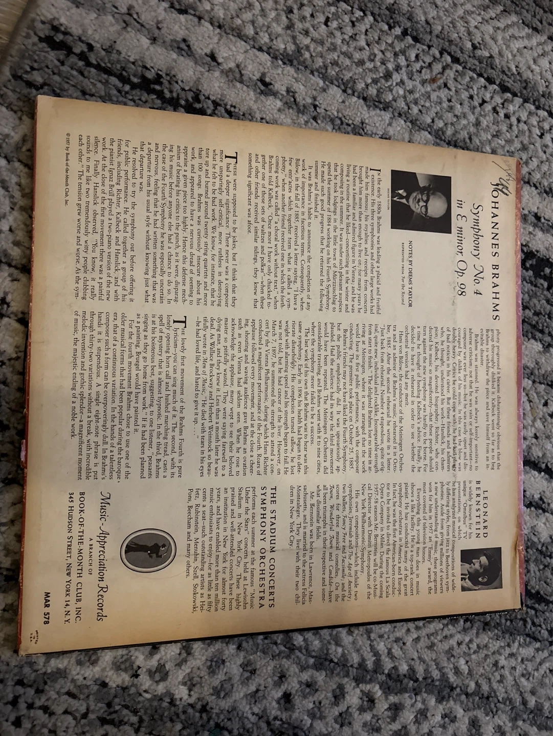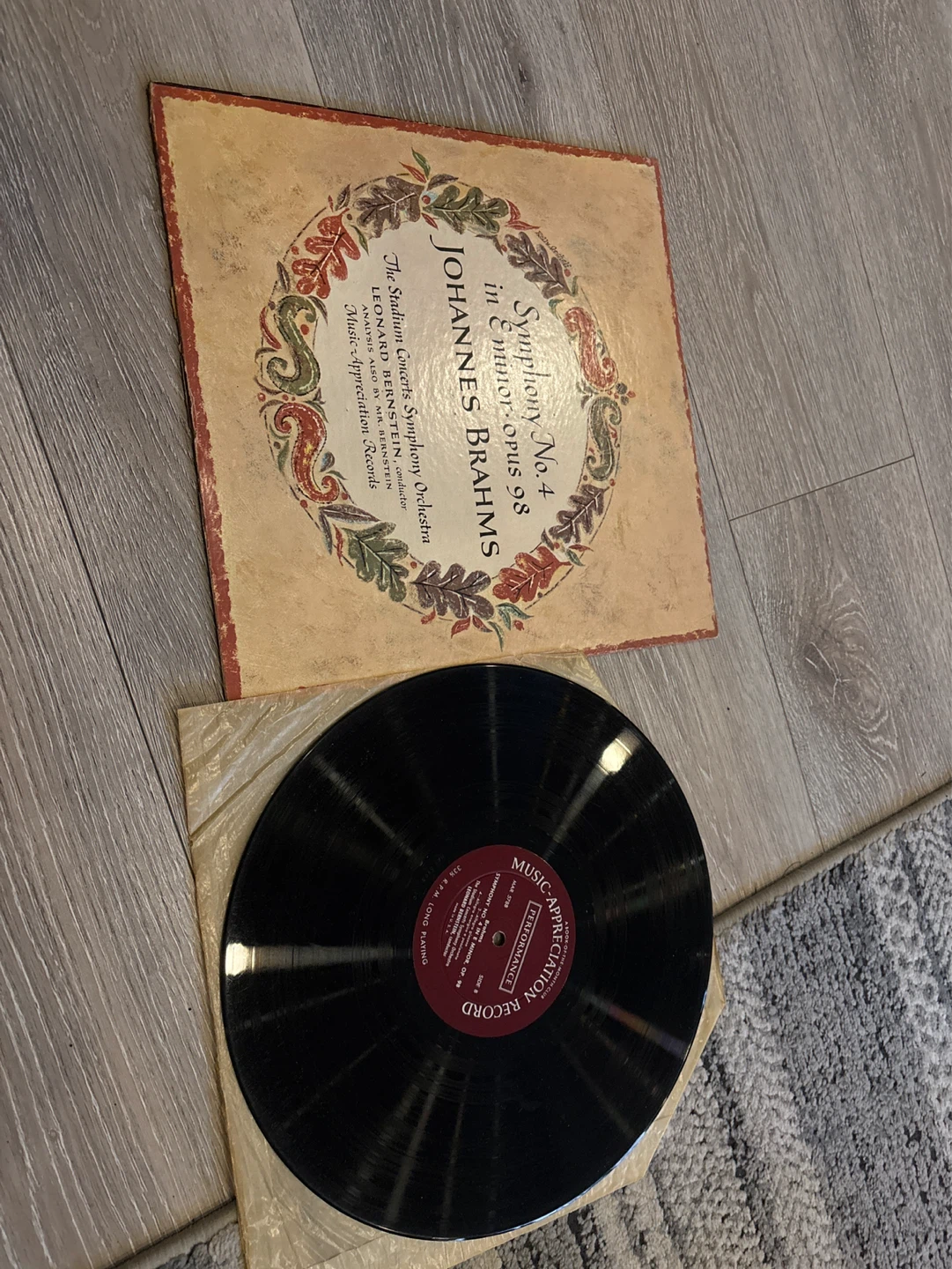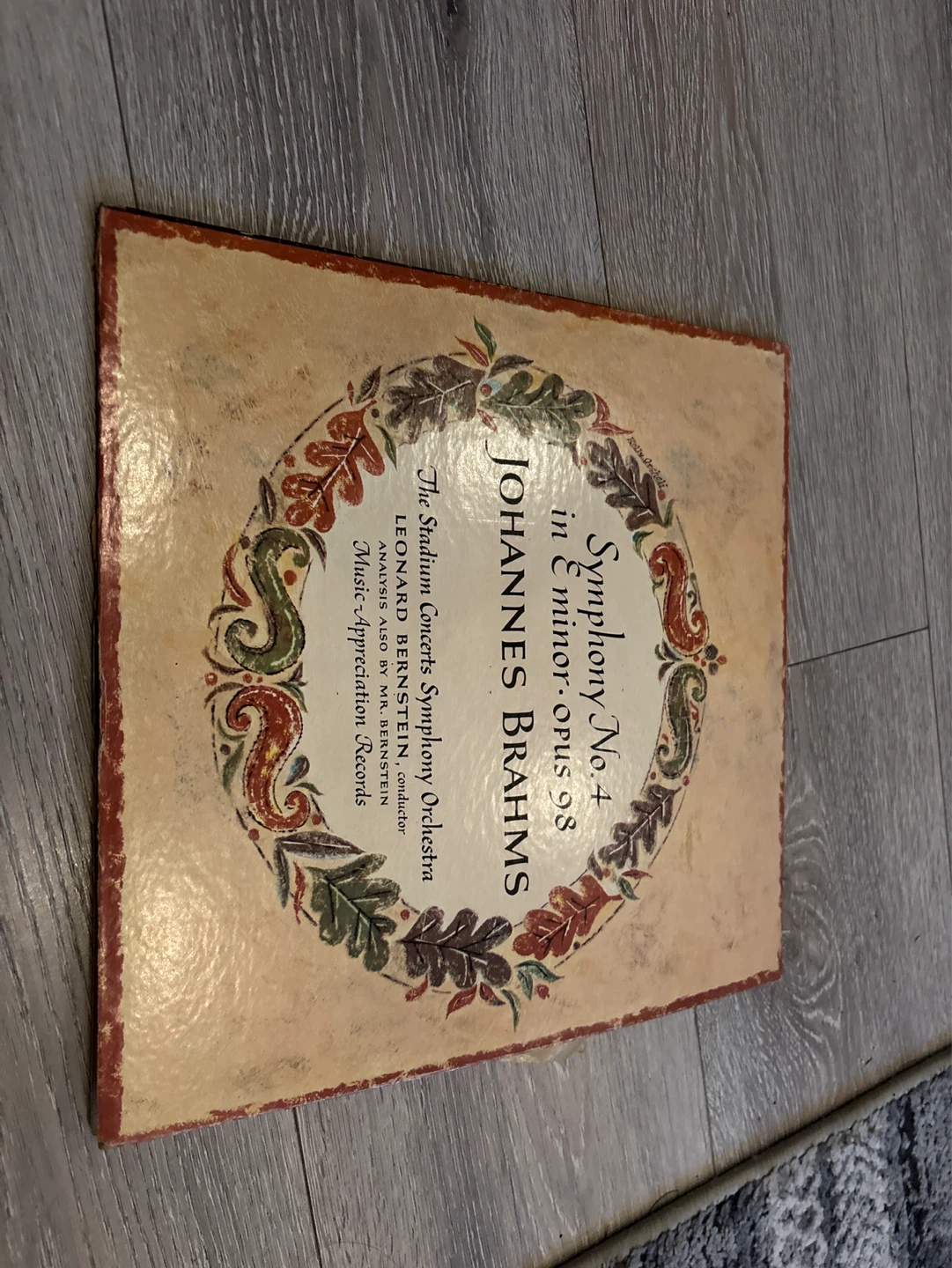 This is the vinyl record for Johannes Brahms' Symphony No. 4 in E Minor, Opus 98. It features the Stadium Concerts Symphony Orchestra conducted by Leonard Bernstein. Analysis is also provided by Mr. Bernstein. Record is from Music-Appreciation Records. Collectible excellent condition