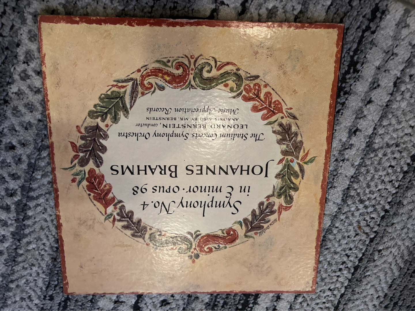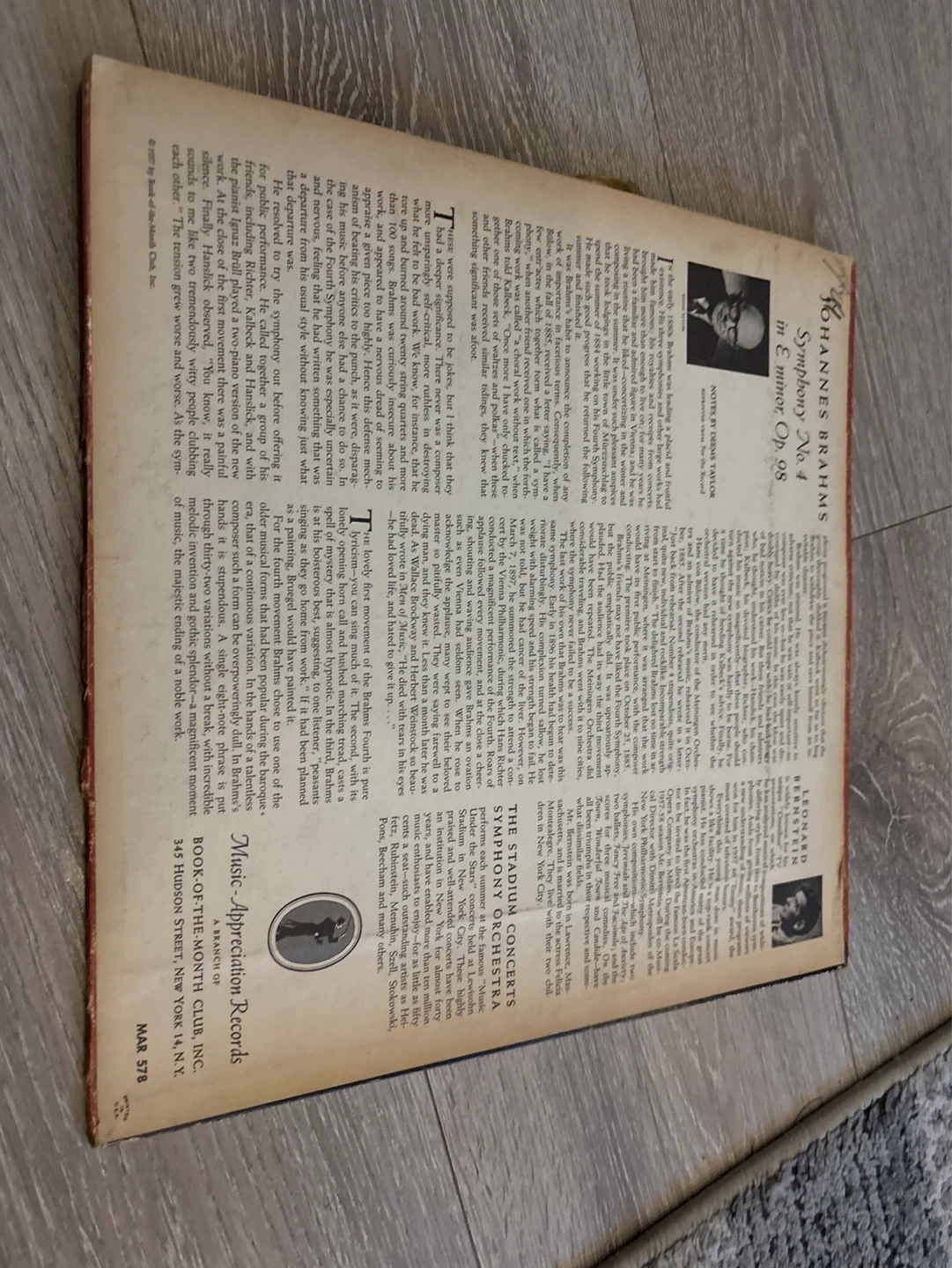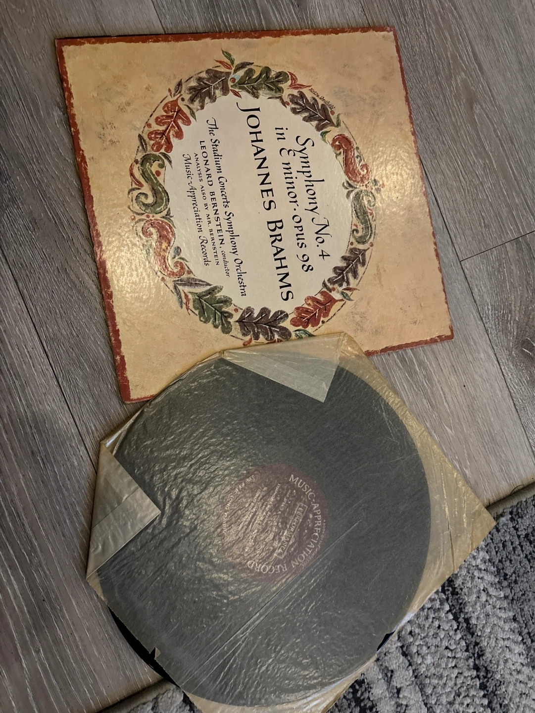 This is the vinyl record for Johannes Brahms' Symphony No. 4 in E Minor, Opus 98. It features the Stadium Concerts Symphony Orchestra conducted by Leonard Bernstein. Analysis is also provided by Mr. Bernstein. Record is from Music-Appreciation Records. Collectible excellent condition